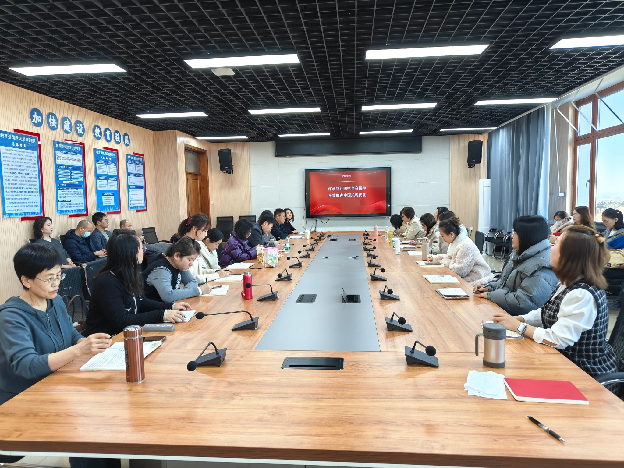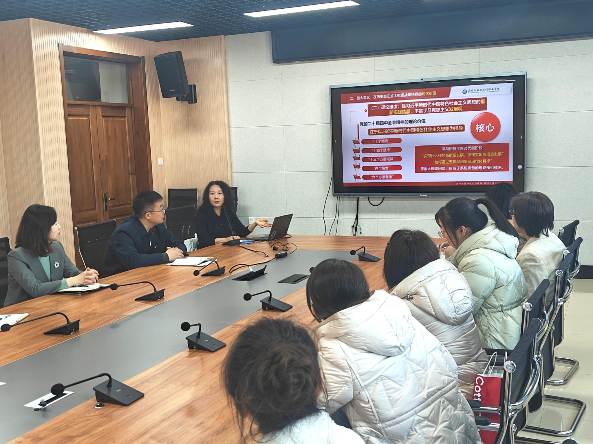 为深入学习贯彻党的二十届四中全会精神,引导全院党员教师切实把思想和行动统一到党中央决策部署上来,11月19日上午,马克思主义学院党总支在南岗校区产教融合大楼812室举行全体党员大会暨“深学笃行四中全会精神 持续推进中国式现代化”专题党课。本次学习活动由学院党总支书记王伟主持,院长王淑桢作专题辅导报告,全院党员教师参加学习。