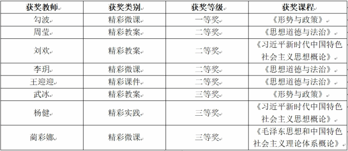 此次“精彩系列”教学成果评选活动,经学校申报、资格审查、专家评定等环节,全省高校共遴选561份个人作品(一等奖93人、二等奖187人、三等奖281人)。马克思主义学院积极落实省教育厅文件精神,以赛促教,以赛促学,以赛促改,以赛促建,《思想道德与法治》教研室、《毛泽东思想和中国特色社会主义体系概论》教研室、《习近平新时代中国特色社会主义思想概论》教研室、《形势与政策》教研室共推荐上报了16作品。在备赛过程中,各教研室深入研讨,积极交流,精益求精,认真磨课,充分展现了马克思主义学院教师的教学能力和团队精神。经大赛专家组评审,获奖情况如下: