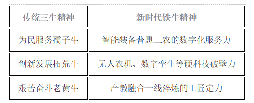 在现代农业装备应用技术专业76年的发展历程中,我们形成了展现农机专业内涵的“铁牛精神”,“铁牛精神”既是对传统“三牛精神”的传承,更是面向农业现代化、智能化的时代升华。其内涵可凝练为以下维度: