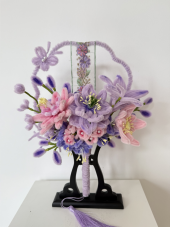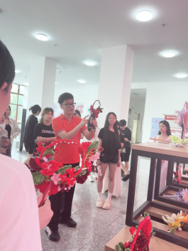 在展览过程中,分院花卉专业教师王巍化身为文化使者,为师生们带来了一场精彩纷呈的知识盛宴。他不仅详细讲解了绒花团扇的造型特点和陈列技术,从扇面的构图设计到绒花的搭配摆放,从色彩的搭配原理到整体的视觉效果,每一个细节都讲解得细致入微、生动形象。