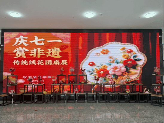 为热烈庆祝中国共产党成立 104 周年,大力传承和弘扬中华优秀传统文化,7月1日,农业装备学院在产教融合大楼一楼大厅精心举办了一场别开生面的“庆七一 赏非遗”传统绒花团扇展。此次展览巧妙地将课堂教学成果与非遗文化深度融合,在党的生日这一特殊时刻,献上了一份独具匠心且意义非凡的贺礼,更让古老的非遗文化在新时代焕发出璀璨夺目的光彩。
