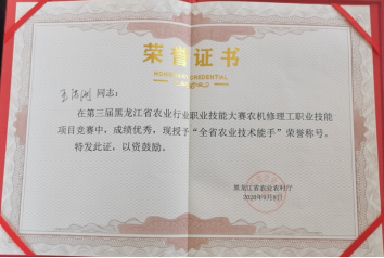 三是专项培育,提高技能。王洪刚在学校系统学习的过程中,在专业教师的帮助和指导下,他的技能技术有了很大的提高,成为了王岗镇里远近闻名的农机驾驶和维修高手。在第三届黑龙江省农业行业职业技能大赛农机修理工技能竞赛中,他荣获三等奖,并获得“全省农业技术能手”称号。在首届乡村振兴农业行业职业技能大赛的黑龙江选拔赛中,他获得了第二名的好成绩。同时,在老师的指导下,他积极参加农机工程分院技能大师工作室的科研和技术改进工作,利用拖拉机履带成功设计并制造出适合大型拖拉机的整地机械耢子,在黑土地保护性耕作中得到广泛应用。