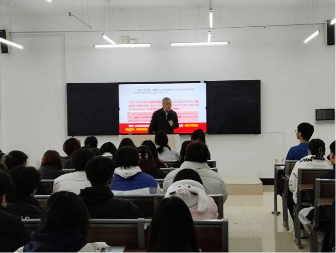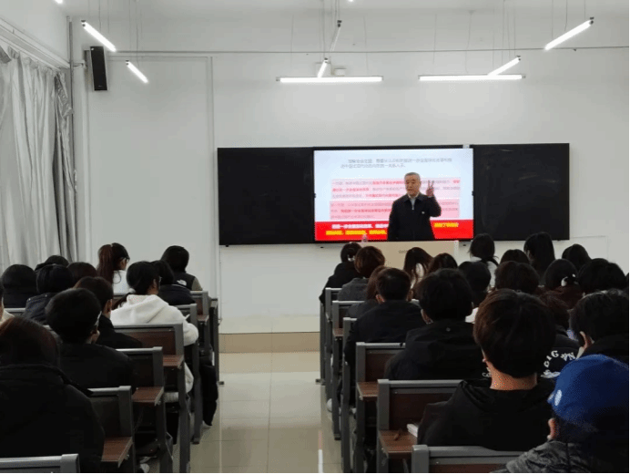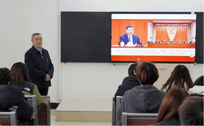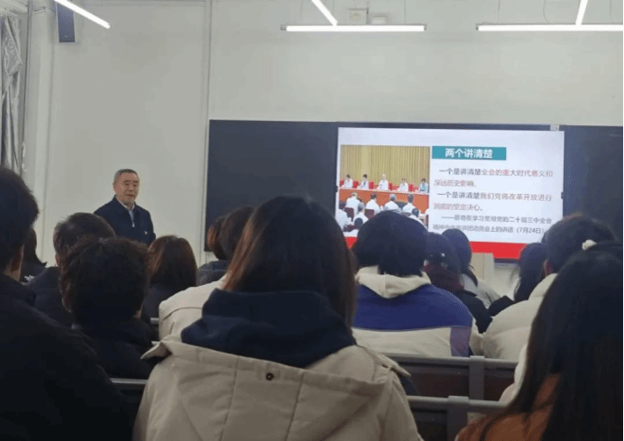 活动开场,焦光纯院长站在宏观视角,深入剖析二十届三中全会的历史背景。其讲述如同展开一幅波澜壮阔的时代画卷,清晰呈现全会召开的重大时代意义,使同学们仿佛置身于历史长河中,深刻认识到此次全会在国家发展进程中的关键地位。随后,焦光纯院长围绕“两个讲清楚”“五个深入宣讲”的关键内容进行重点解读。讲解深入浅出,将深奥的理论化为通俗易懂的表达,极大加深了同学们对全会精神的理解,让理论之根深深扎入同学们的思想土壤,滋养其精神世界。