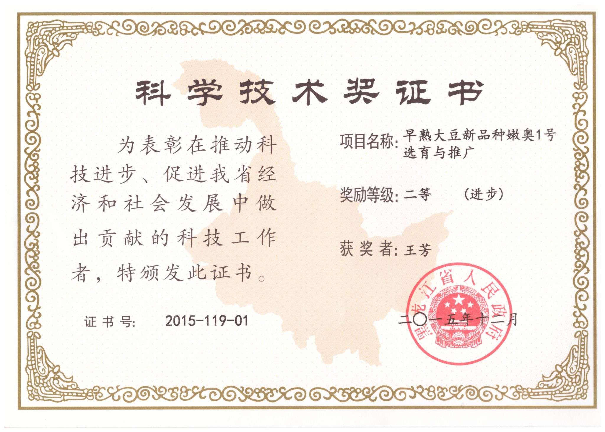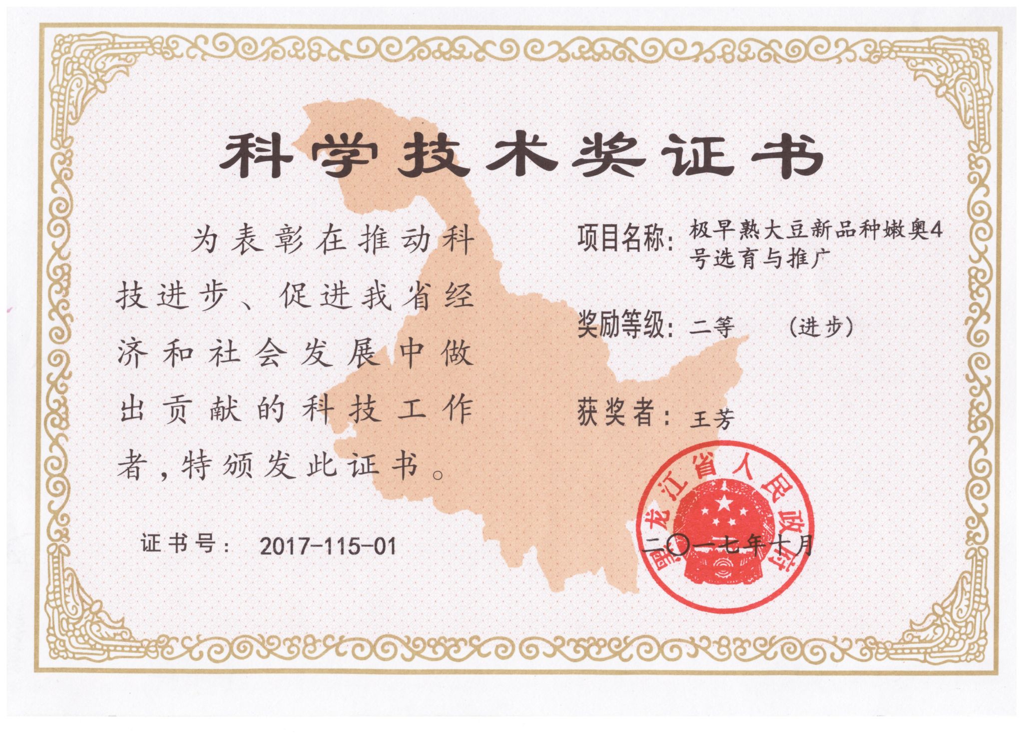 2015年“早熟大豆新品种嫩奥1号选育与推广”获黑龙江省科技进步二等奖(排名第1位);2017年“极早熟大豆新品种嫩奥4号选育与推广”获黑龙江省科技进步二等奖(排名第1位);2016年主持“极早熟大豆新品种嫩奥4号选育与推广”获省农委科技进步二等奖(排名第1位);2014年“早熟大豆新品种嫩奥1号选育与推广”获省农委科技进步一等奖(排名第1位);2011年主持“高蛋白大豆北疆2号选育及推广”项目,获省农委科技进步一等奖(排名第1位)。