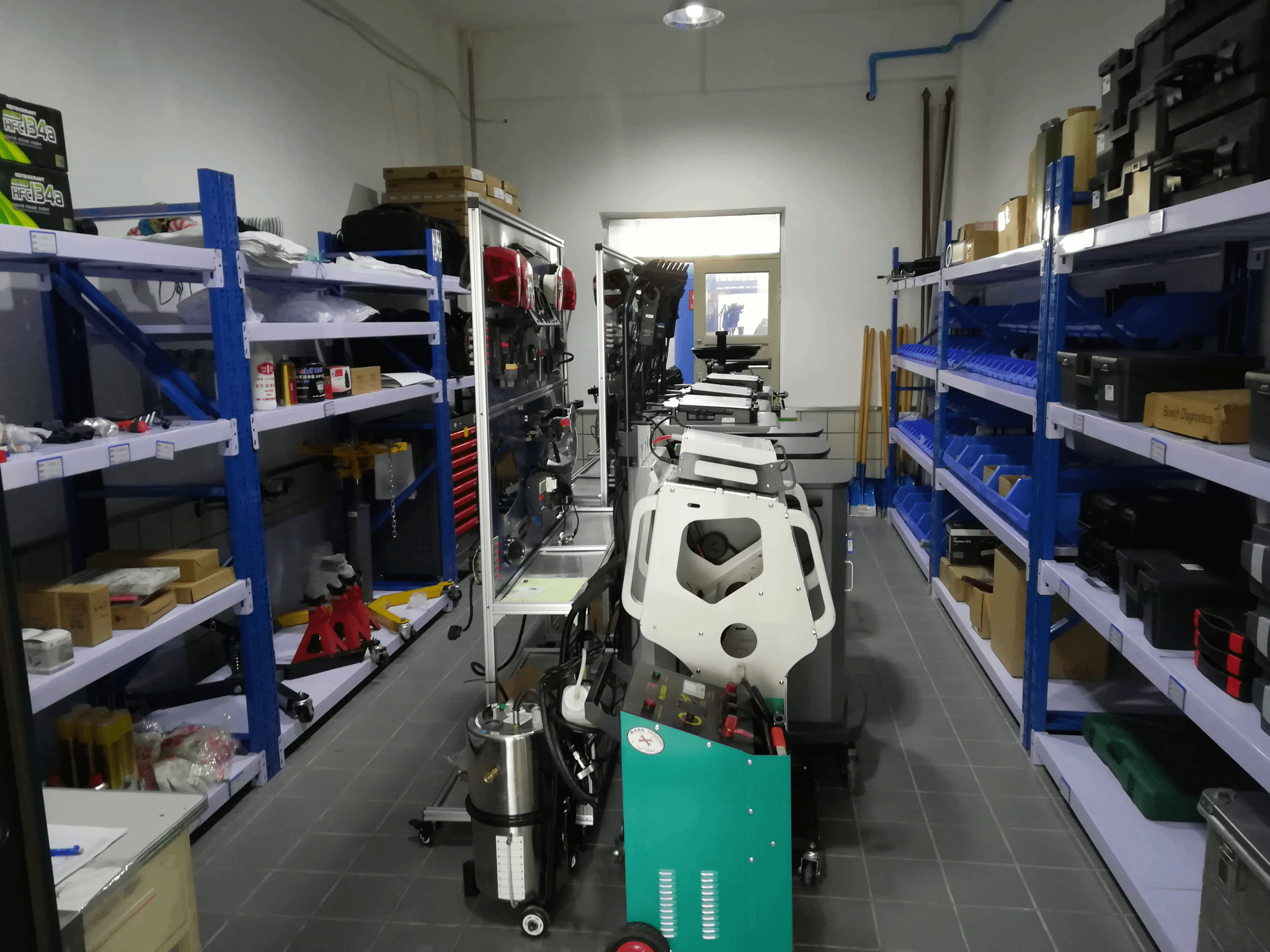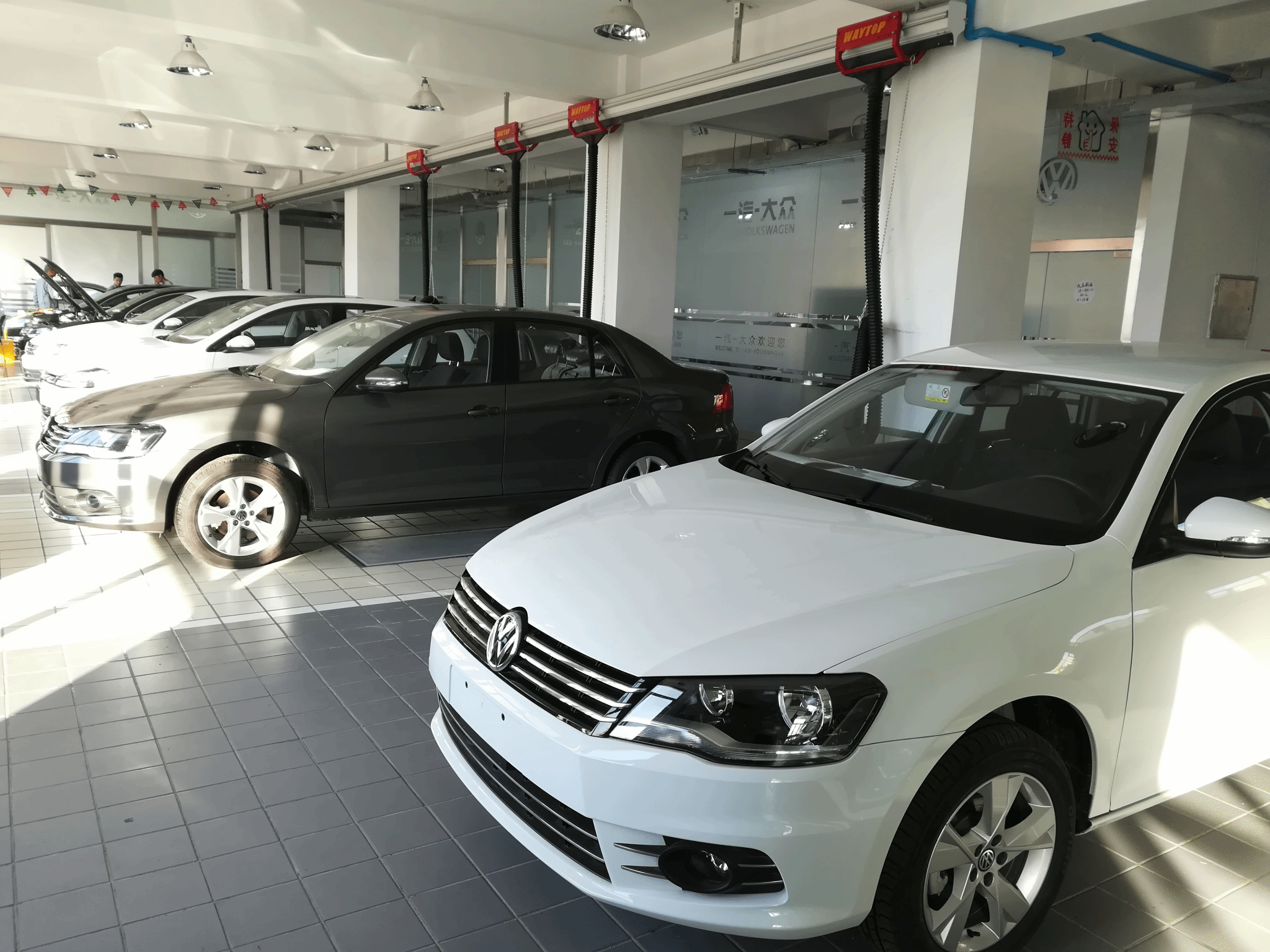 实训车间配有整车实训工位5个、四轮定位工位1个、轮胎拆装工位1个、车轮动平衡工位1个;配有一汽-大众迈腾、宝来、速腾等8台实训车辆。所有实训工位均配有高压气鼓、照明电鼓、尾气抽排系统和消防等安全防护系统。在车间内可完成发动机、底盘、汽车电器、发动机电控、汽车底盘电控、车载网络等技术类课程教学。