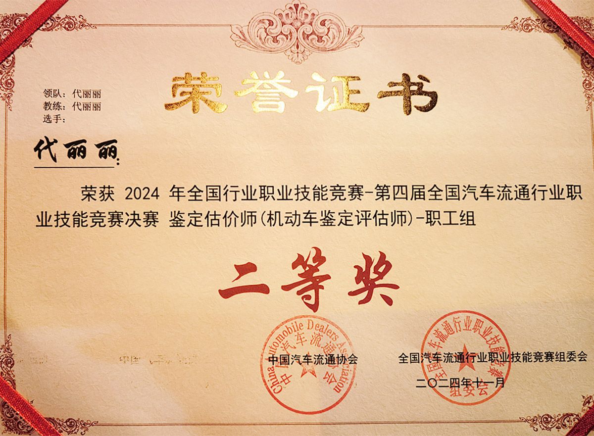 本次竞赛汇聚了全国汽车流通行业职业技能教育的力量,搭建了机动车鉴定评估领域人才交流与展示的平台,紧密围绕企业与行业的实际需求,聚焦于“机动车鉴定评估”与"二手车销售",全面展现全国行业企业员工、院校教职工及学子的卓越风采。我院汽车工程分院代丽丽老师经过初赛选拔,以黑龙江省第一名的成绩入围全国总决赛。在总决赛的赛场上,代丽丽老师展现出良好的数字化素养和精湛的技术技能,依次完成了二手车委托业务办理、车辆技术鉴定、二手车估价销售、新能源汽车机舱和电池鉴定等共计12项工作任务。最终,从全国近30个省(区、市、自治区)的200多位选手中脱颖而出,取得了优异的成绩。