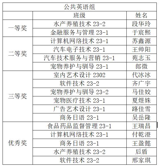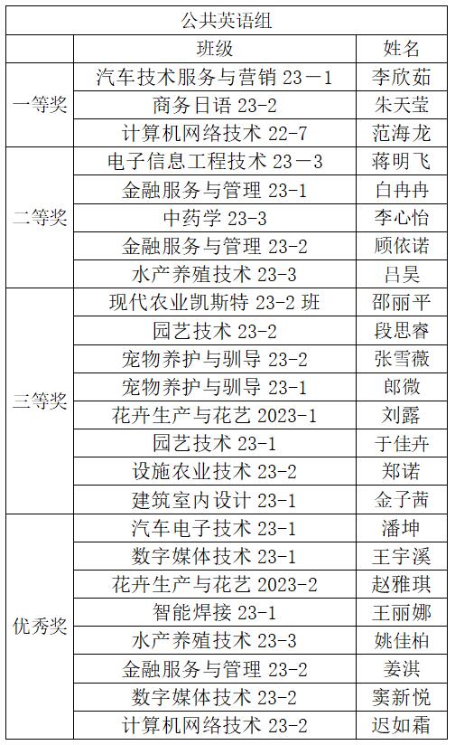 根据2023年黑龙江省职业院校“外研社杯”职场英语挑战赛演讲比赛实施方案,最终拟推荐公共英语组李明明老师指导的学生段华玲(水产养殖技术2023-2),高本贯通组史艳丽老师指导的学生薛智恒(现代农业装备技术(高本贯通)2023-3),代表我院参加2023年黑龙江省职业院校“外研社杯”职场英语挑战赛演讲比赛;拟推荐公共英语组张金媛指导的学生李欣茹(汽车技术服务与营销2023-1),高本贯通组毛嘉岳指导的学生金钊(生物制药技术(高本贯通)23-4),代表我院参加2023年黑龙江省职业院校“外研社杯”职场英语挑战赛写作比赛。
