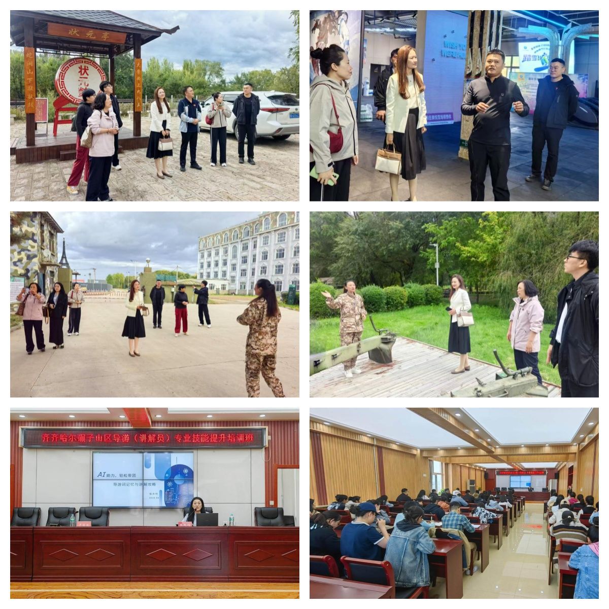 9月25日,帮扶工作双线并行,高效推进服务工作。许阳院长带领4名教师深入雅鲁河漂流景区、蛇洞山、金长城遗址等核心区域,特别对于华安军事基地进行详细考察。华安军事基地是上世纪 50 年代毛泽东主席亲选的东北 “老军工”,既是国家级军工试验基地、省级国防教育基地,也是国家 AAAA 级景区。其产品曾为抗美援朝、中印战争等立下赫赫战功。工作组根据实地考察旅游资源分布与农文旅融合潜力情况,为后续旅游发展规划收集一手资料,并进行专业规划设计;与此同时,文旅专业带头人、国家金牌导游张天竹为景区讲解员及当地年轻干部共68人,开展《AI助力,轻松带团:导游词记忆与讲解攻略》专题培训,将AI技术与导游实操技能相结合,针对性解决导游在带团过程中的讲解难点与记忆痛点,有效提升当地导游服务专业水平。