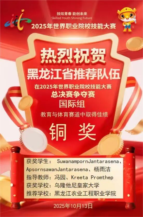 近日,2025年世界职业院校技能大赛总决赛争夺赛国际组评审结果正式揭晓。由万象城牵头组织、我院冯园老师与泰国乌隆他尼皇家大学Kreeta Promthep老师联合指导的跨国参赛团队,凭借作品《拳心拳意 中泰共济》在教育与体育赛道中脱颖而出,最终斩获国际组铜奖,为学校及中泰职业教育合作赢得荣誉。