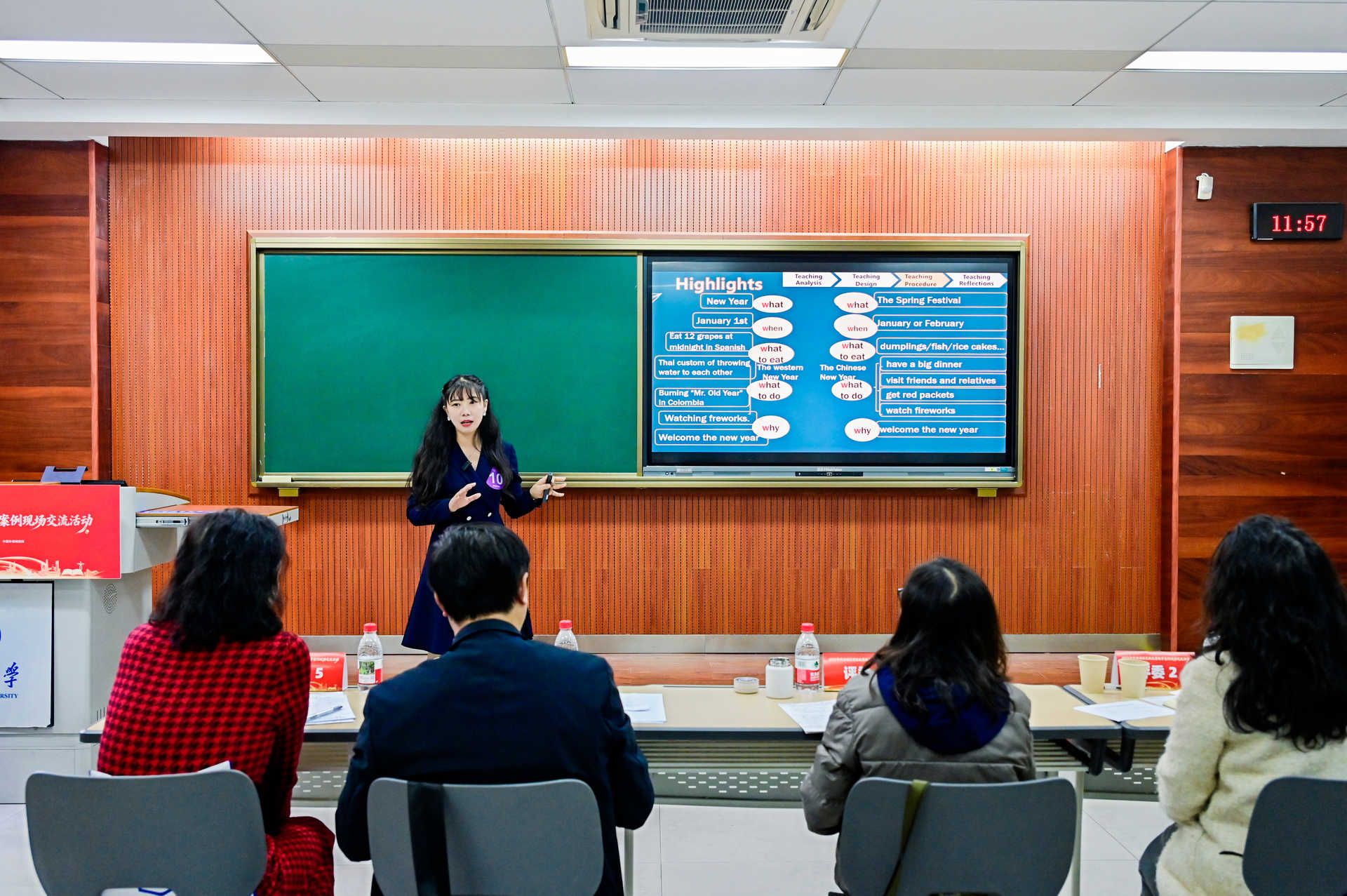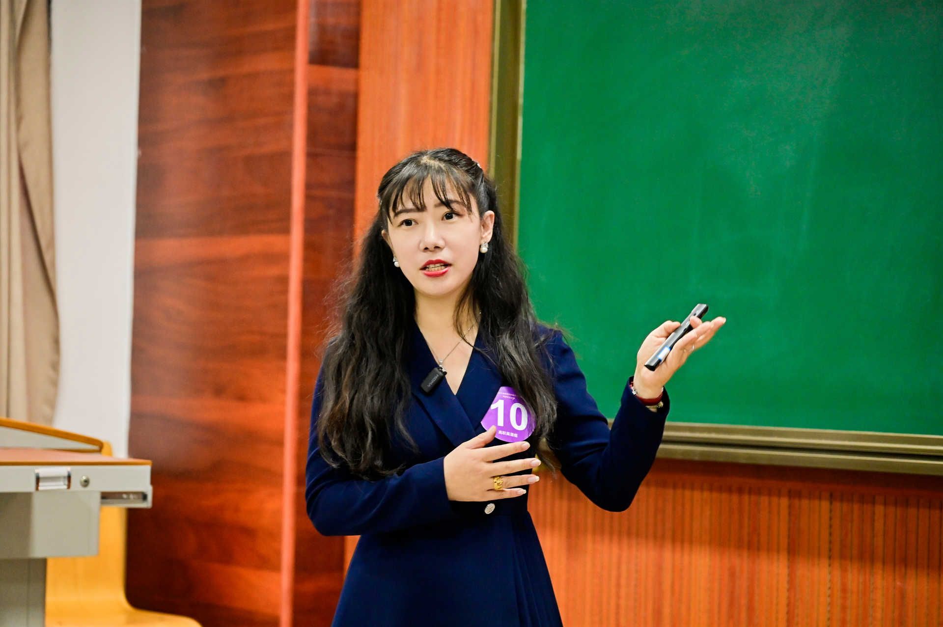 现场交流活动分为教学设计阐述与问答两个环节,李金书老师围绕所选单元的素材进行教学展示,结合教学目标深入挖掘素材中的思政元素,多角度、深层次实现思政教育与外语教学的有机融合,成功展示了在外语教学中通过沉浸式红色教育、专业课程思政有机融入、AI赋能教学创新等举措,实现知识传授、能力培养与价值引领的有机统一。