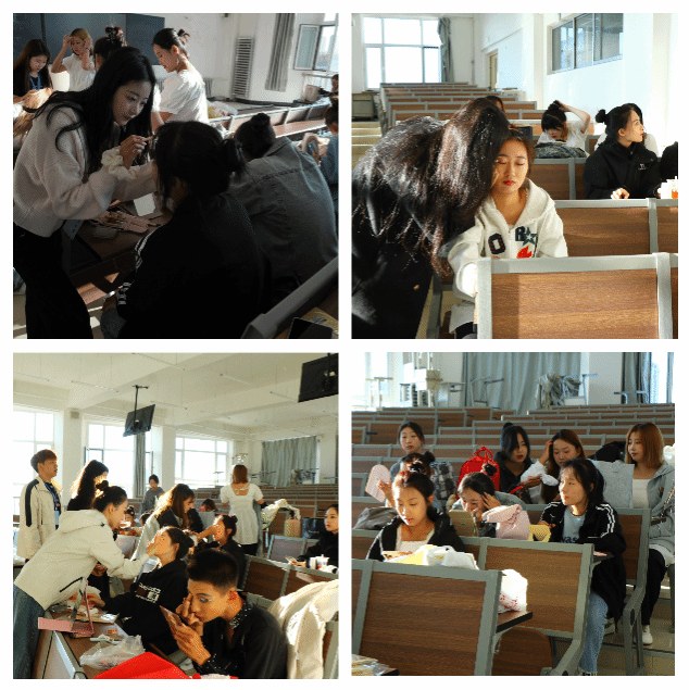 学生志愿者为团体操的同学们化妆