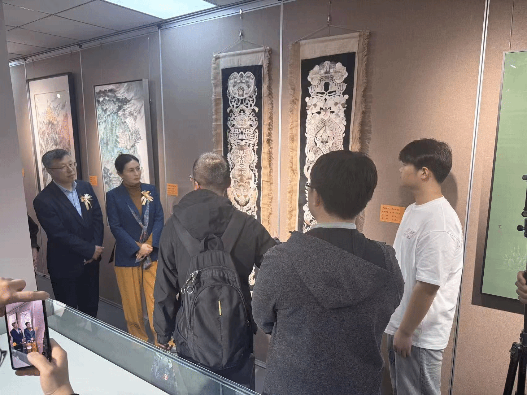 黑龙江省文联党组成员、副主席杨柏婷与哈尔滨市文联党组书记孙建伟,听取学生毕岩松作品汇报