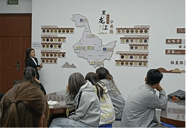 四位23级宣讲团讲解员化身“文化向导”,带领新学员系统参观中药标本馆,通过腊叶标本展示区的植物学溯源,到黑龙江道地药材专区的“龙九味”解读;从中药文化墙上专业名词的梳理,到中医药名家学术贡献的深度阐释;最终聚焦药食同源的现代应用,完整构建了"从山林到餐桌"的中医药认知体系,让学员深刻体悟"一草一木皆学问"的文化深意。