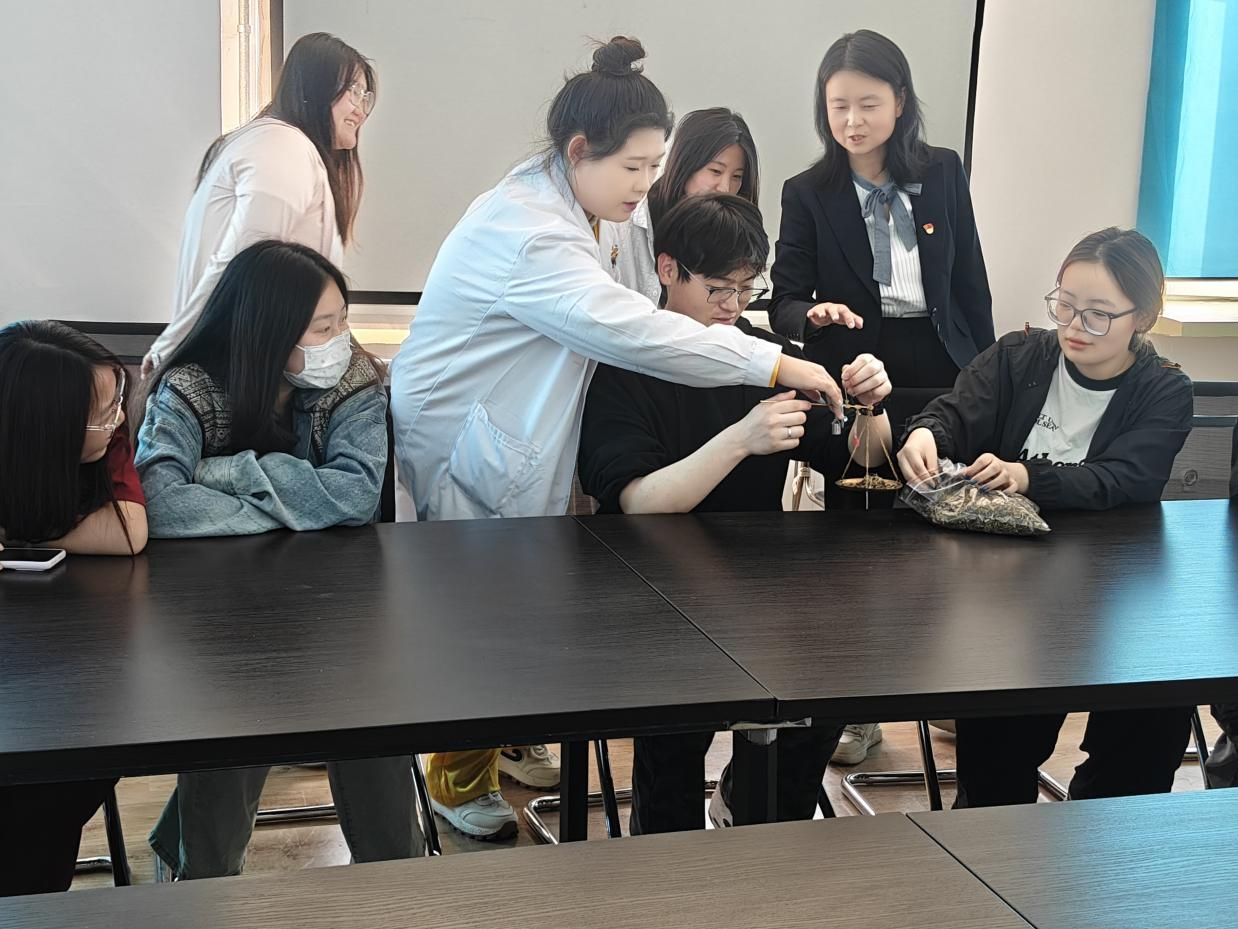 宣讲团成员们现场展示了传统中药称量工具戥称的使用方法,以及冲筒的操作技巧。艺术学院同学们积极体验戥称称量,在宣讲团成员的协助下,完成了具有驱疫驱虫和疏肝解郁功效的两种香囊的制作。