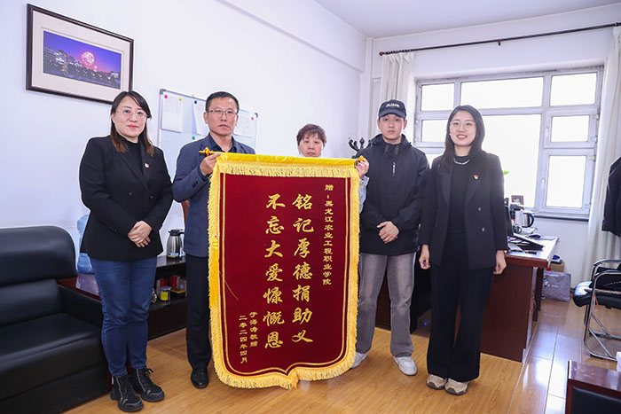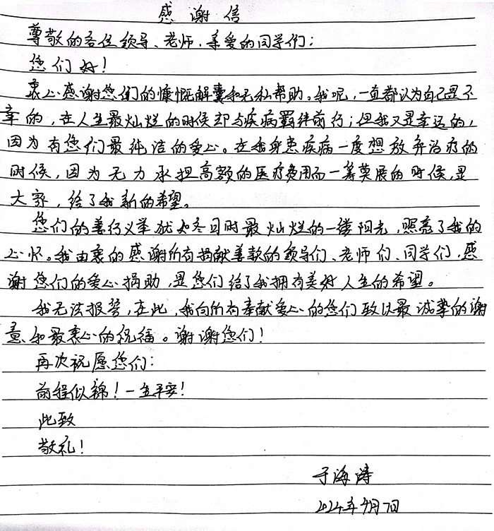 爱心在农工涌动,温暖在师生心间。此次募捐活动不仅为于海涛同学提供了经济上的帮助,更给予了他精神上的支持和鼓励。目前,于海涛同学身体恢复较好,已经回归课堂和同学们一起参加校园活动。于海涛同学手写书信表达对老师、同学们以及社会各界爱心捐款人士的感谢,并与母亲送来锦旗表达心意。此次活动让大家深刻地体会到了团结与爱的力量,生动地展现了我院师生博爱互助、无私奉献的良好品格,进一步增强了我院师生之间的凝聚力和向心力。