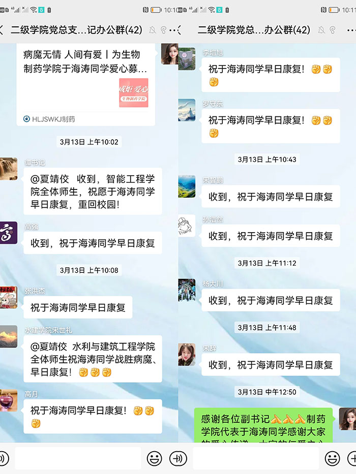 募捐活动前,生物制药分院党总支书记李广宇、副书记夏靖佼和辅导员王秋爽分别与于海涛同学进行谈心劝慰,希望于海涛同学能够始终保持积极健康的心态,勇于面对困难。在募捐活动中,生物制药分院制定了详细的募捐计划,捐款分为线上、线下两种渠道,线上捐款由辅导员王秋爽老师设立捐款二维码,线下捐款由各班级组织开展“携手抗癌,共筑希望”捐款活动。生物制药分院的老师和学生们自发通过朋友圈、微信群等多渠道扩大宣传,募捐活动得到了各部门师生、学生家长及社会爱心人士的广泛关注和参与。募捐活动结束后,由教师、学生募捐监督小组对募捐金额进行审核,并在生物制药分院党政联席会议上进行公示。募捐款共计74539.6元,全部用于帮助于海涛同学支付医疗费用。
