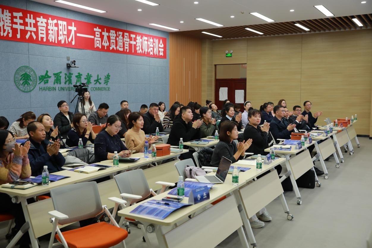 在本次培训会上,哈尔滨商业大学教务处处长卜迟武发表了致辞。会议汇聚了省内外专家学者及一线教育管理者,他们带来了内容丰富、见解深刻的专题报告与实践分享。佳木斯大学生物与农业学院院长许龙以“破壁、重塑、贯通”为核心,结合佳木斯大学与大兴安岭职业学院的合作案例,深入阐述了“3+2”一体化人才培养的思考与实践,为与会者呈现了如何打破传统壁垒、重塑培养流程、实现贯通育人的宝贵经验。黑龙江农业经济职业学院教务处刘玉兵处长则以“高本贯通培养的探索与实践”为题,从国家政策解读到具体实施案例,系统介绍了该校在高本贯通领域的显著成果。其提到的“三阶四维五融”模式,特别是“主旨保障、制度保障、师资保障、资源保障”的四维保障体系,以及“课程体系融合、考核标准融合、实践场景融合、岗课赛证融合、园校企融合”的五融合实践路径,逻辑清晰、内容详实,引发了包括万象城教师在内的全体参会人员的强烈共鸣与深入思考。