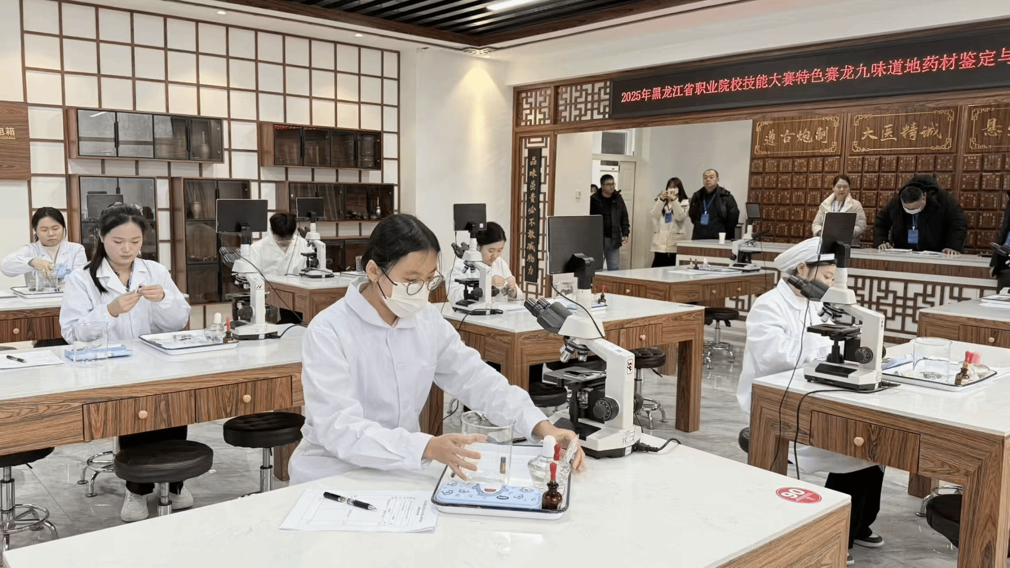 竞赛中,各参赛选手精神饱满、沉着应战,在药材真伪鉴别、显微特征观察、制剂工艺设计等环节展现出扎实的专业功底和娴熟的操作技能;裁判团队严格遵循 “公平、公正、公开” 原则,从专业素养、操作规范、成果质量等多维度进行综合评审,确保赛事的权威性与专业性。