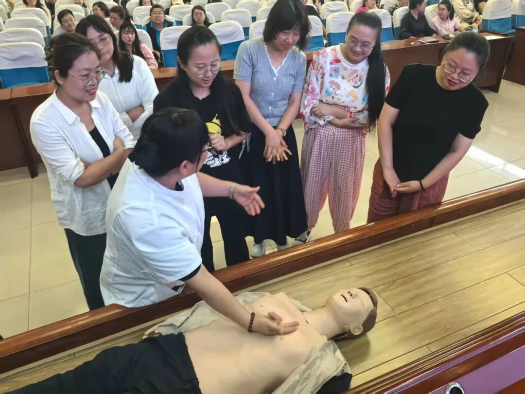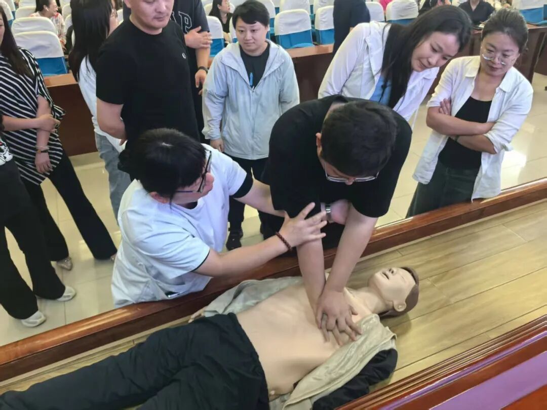 在理论培训环节,校卫生院科长苗军凭借丰富的临床经验,系统讲解了心肺复苏(CPR)、自动体外除颤器(AED)使用、海姆立克急救法等急救知识的操作要领和注意事项,并通过真实案例强调了"黄金救援4分钟"的重要性。