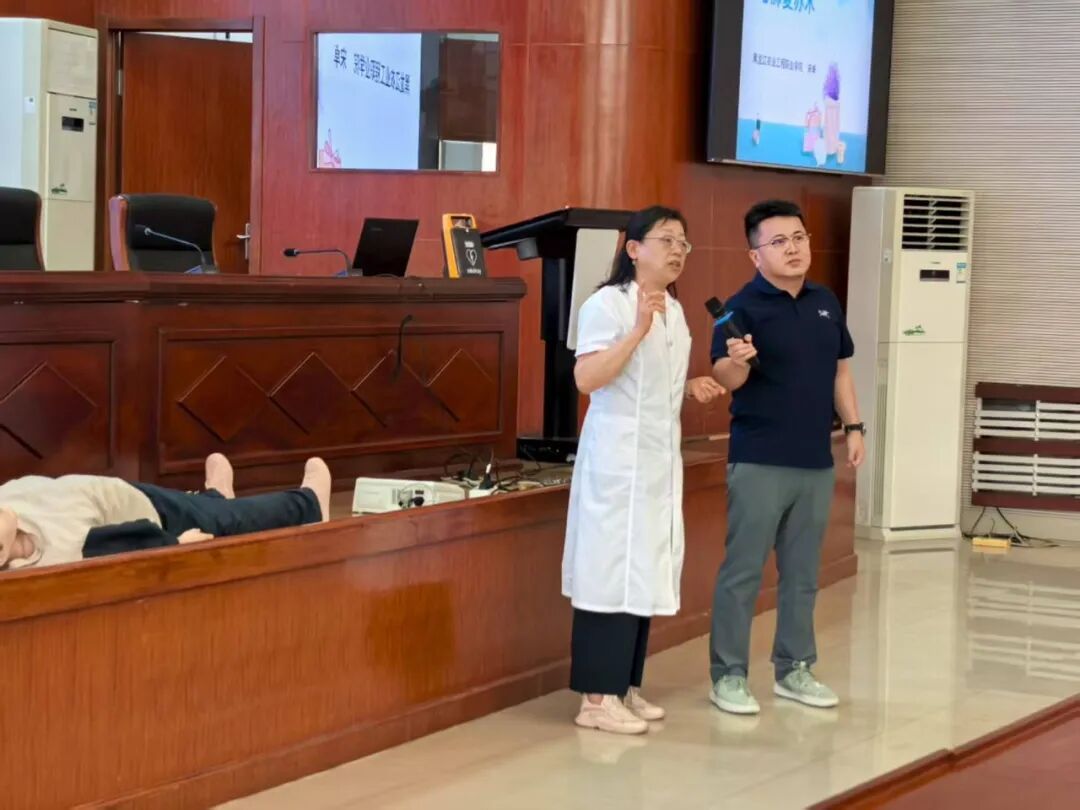 随后进行的实操训练环节中,参训人员在苗科长及医护人员的指导下,分组进行了心肺复苏和AED使用的模拟训练。大家认真练习胸外按压操作要领,确保动作标准、流程规范。现场学习氛围浓厚,互动积极,取得了良好的实训效果。