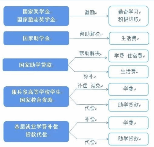 国家在高等教育本专科阶段建立起国家奖学金、国家励志奖学金、国家助学金、国家助学贷款等多种形式有机结合的高校学生资助政策体系。