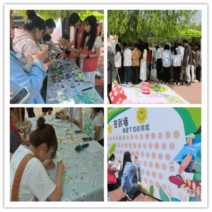 各二级心理辅导站也准备了精彩的活动。经济管理学院的“指尖生趣 心韵流转”手工创作活动、生物制药学院的“我的璀璨串珠”手工串珠活动、人文艺术学院的“心灵手绘 向阳而生”脸谱彩绘活动、机械工程学院的“植愈书间 自然手记”植物贴画活动、动物科技学院的“关爱心灵 ‘牧’光同行”羊毛毡手工活动、农学院的“耕心育穗 心灵种子站”种子盲盒活动、动物医学学院的“圈住幸运 拆出温暖”套圈盲盒活动、农业装备学院的“眼疾手快、挑战味蕾”团体游戏活动、信息工程学院的“烦恼丢丢丢、飞运乒乓球、踏步大闯关”趣味挑战活动、水利与建筑工程学院的“撕掉标签 青春不被定义”撕标签活动、汽车工程学院的“为你助‘力’”体能健身活动、智能工程学院的“小美满分享站”心灵充电活动……让同学们在努力完成任务的过程中,不仅收获了礼物,也收获了一份积极体验和感悟。