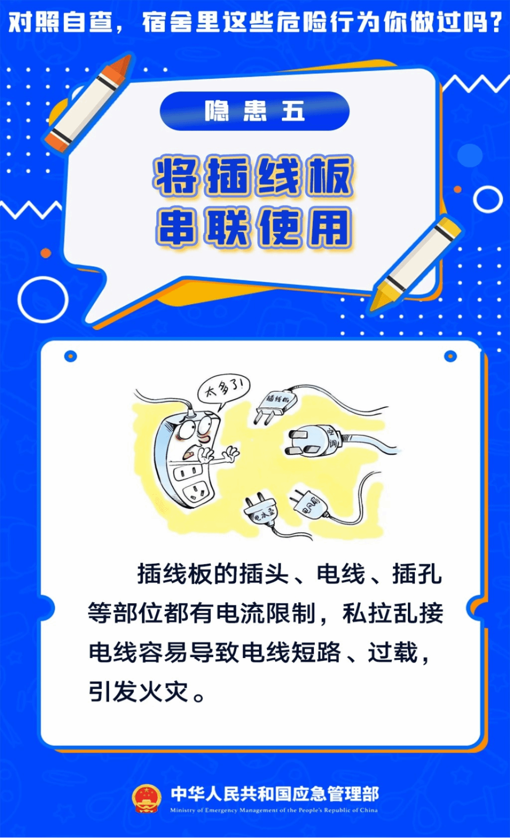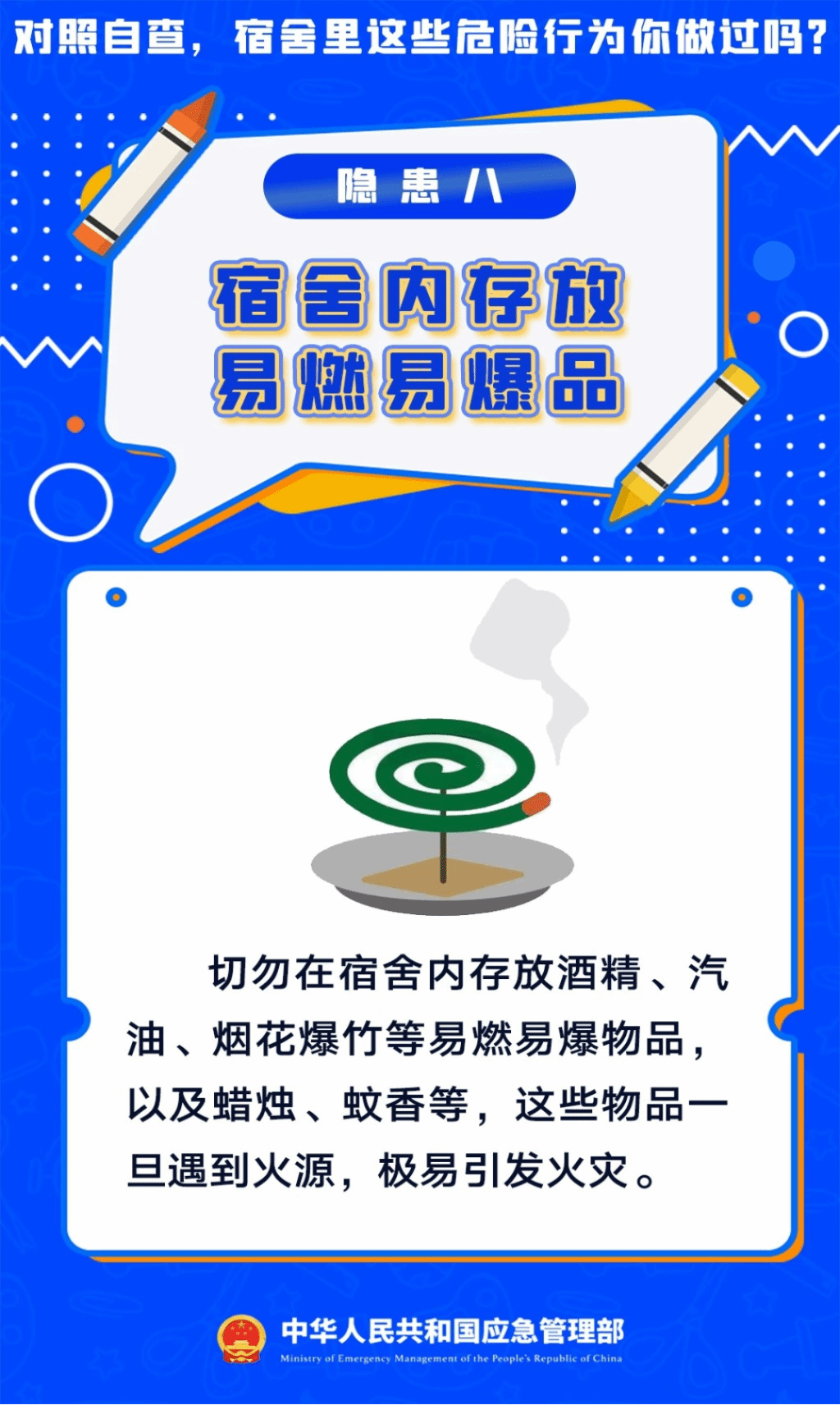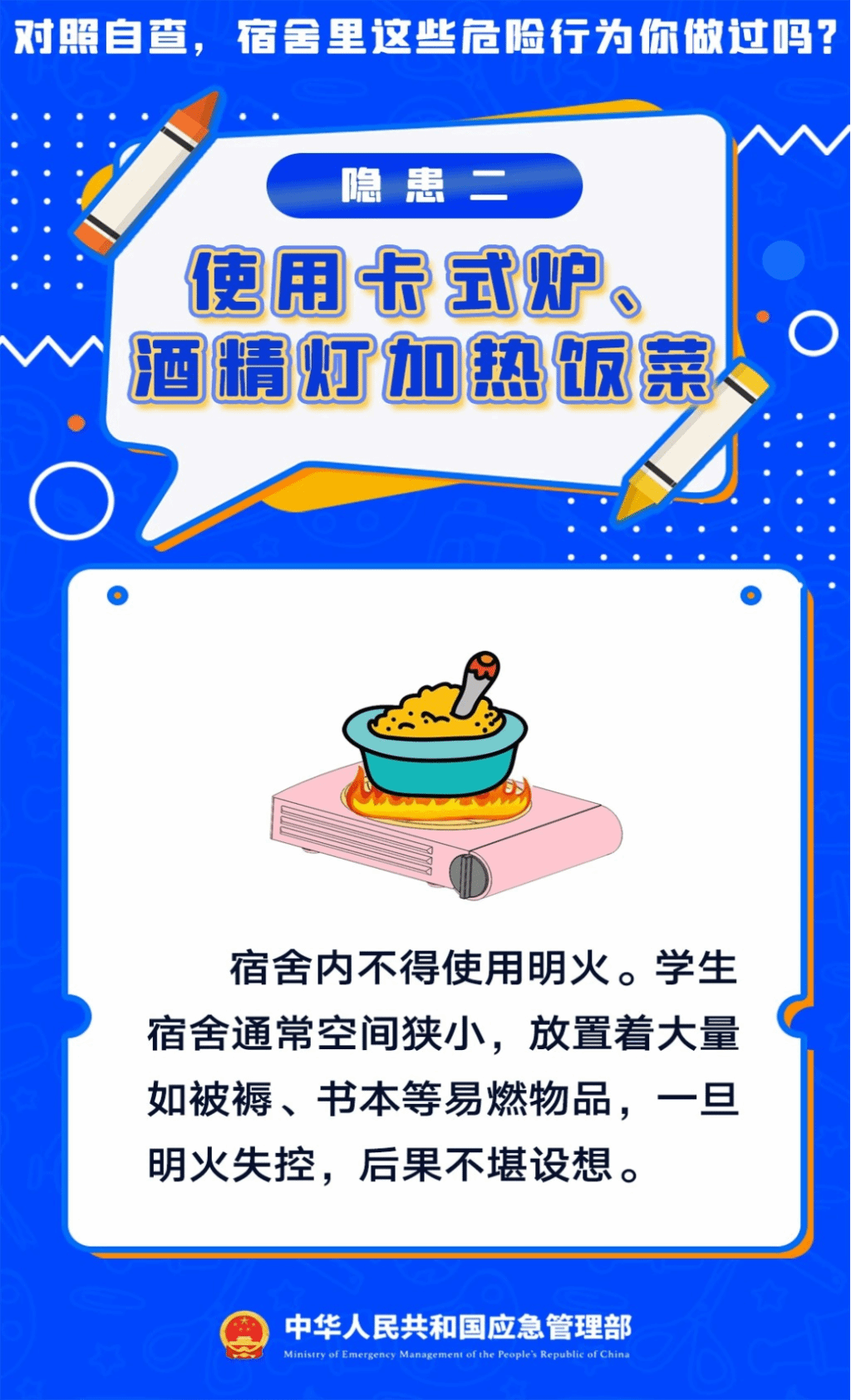 安全事故大多都是人的不安全行为所致,以上案例反映出,少数同学防火意识不强,不遵守制度规定,违规用电用火造成宿舍火灾。我们要充分认识到宿舍安全的重要性,提高安全意识,培养良好生活习惯,严格遵守规章制度,一起携手共建平安校园!以下宿舍8大危险行为,请同学们务必对照自查。