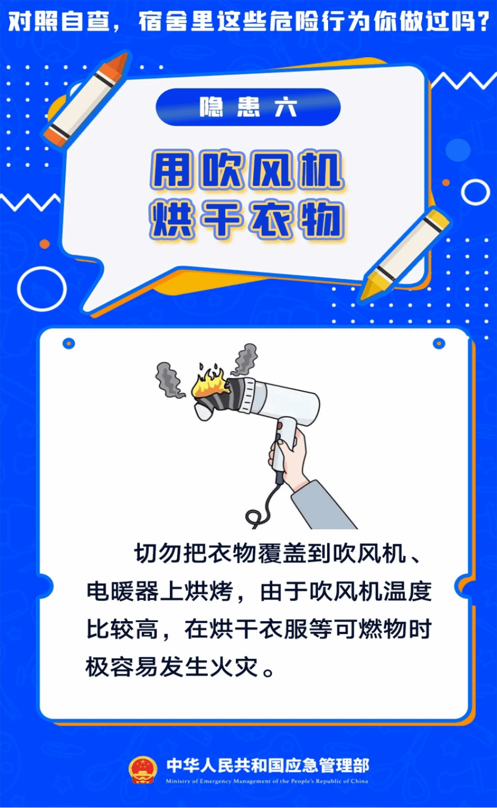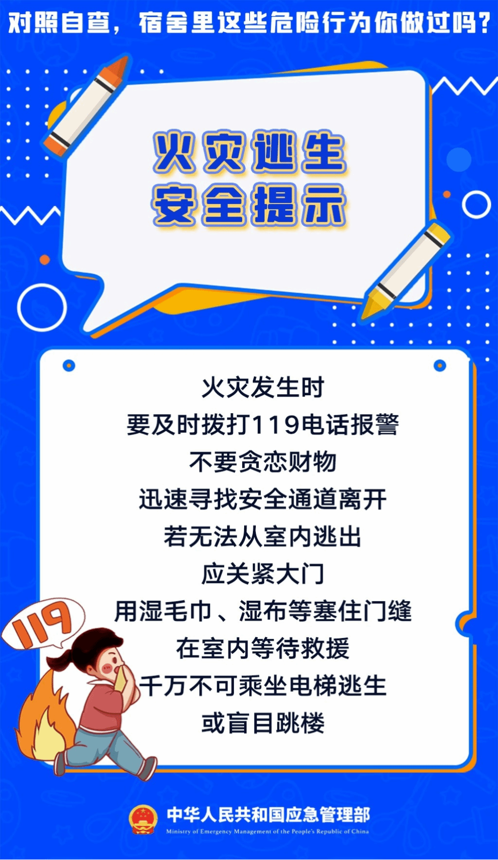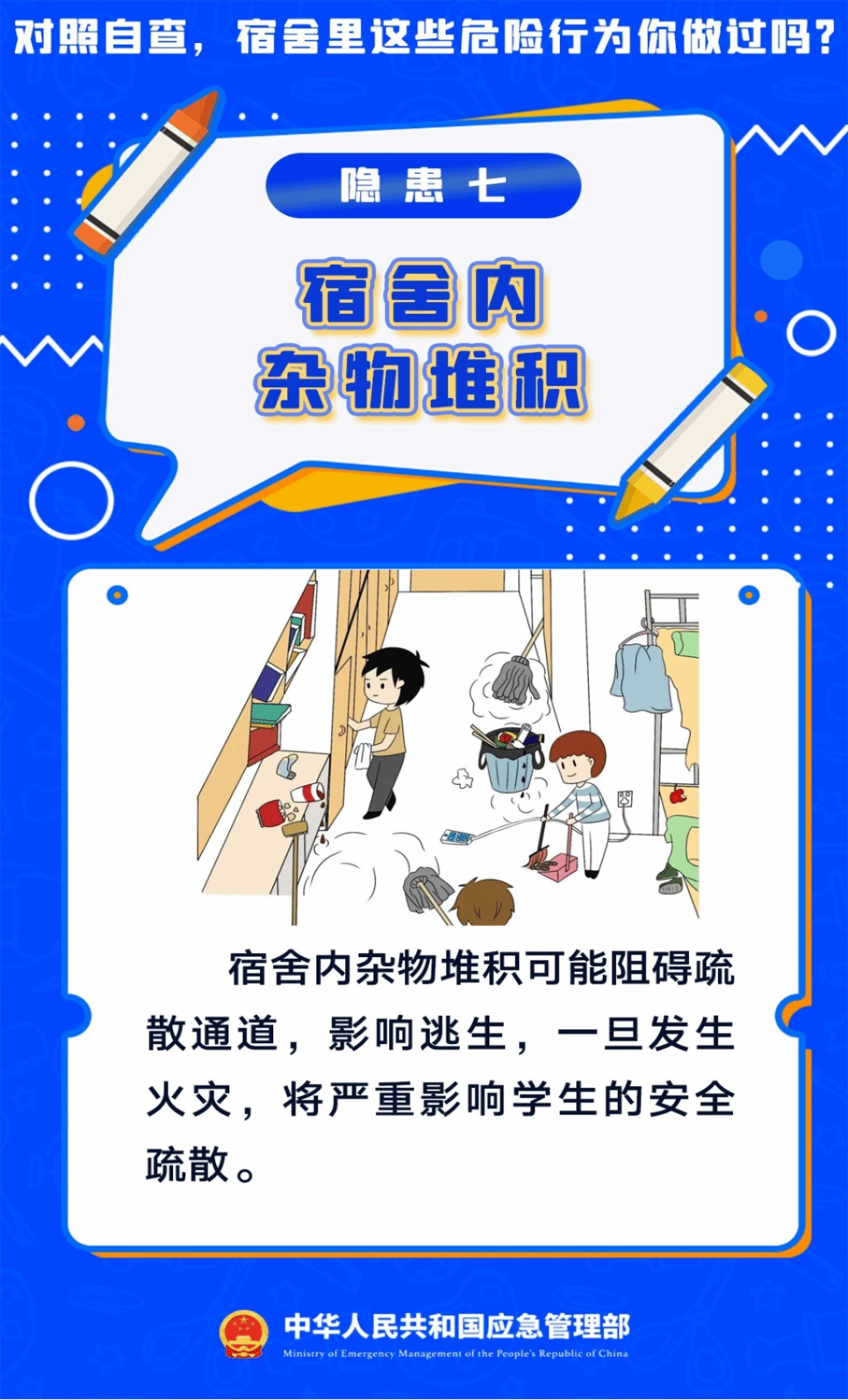 安全事故大多都是人的不安全行为所致,以上案例反映出,少数同学防火意识不强,不遵守制度规定,违规用电用火造成宿舍火灾。我们要充分认识到宿舍安全的重要性,提高安全意识,培养良好生活习惯,严格遵守规章制度,一起携手共建平安校园!以下宿舍8大危险行为,请同学们务必对照自查。