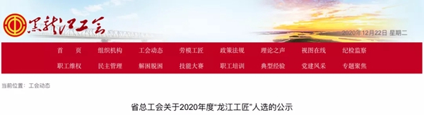 日前,黑龙江总工会发布2020年度“龙江工匠”人选的公示,公示显示,2020年度树选100名“龙江工匠”。其...