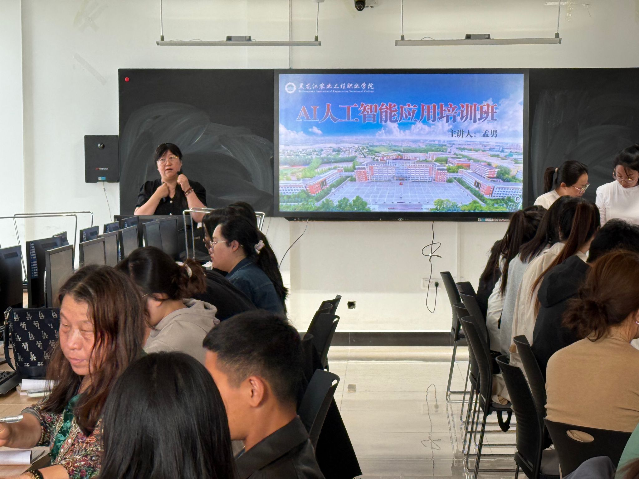 培训过程中,孟男老师以“生成式AI与数字化课堂融合”为重点,从AIGC的核心特性入手,结合职业教育教学实际,梳理了多款适配教育场景的AI平台应用逻辑,通过精彩教学范例,展示了AI在课件生成、课堂互动设计、学情分析等环节的应用方法,让抽象的技术原理与具体教学场景深度结合。刘静老师则聚焦实操技能,现场演示了文生文、文生图及数据处理类AI工具的使用流程,针对教师们在工具操作中遇到的问题进行一对一指导。实操展示环节成为培训亮点,参训教师纷纷拿出电子设备参与练习,现场交流氛围热烈,有效打破了技术应用壁垒。此外,两位老师还针对人工智能在科研开发方面的应用热点问题,为参训教师提供了专业建议与发展期待。