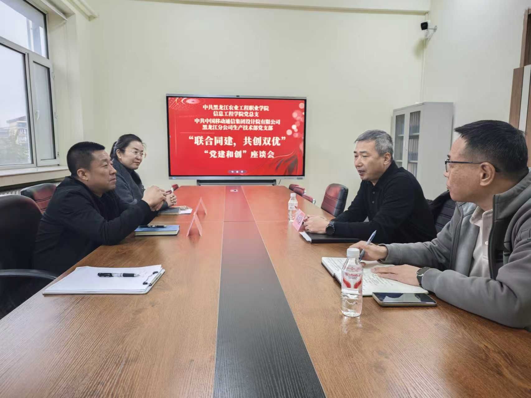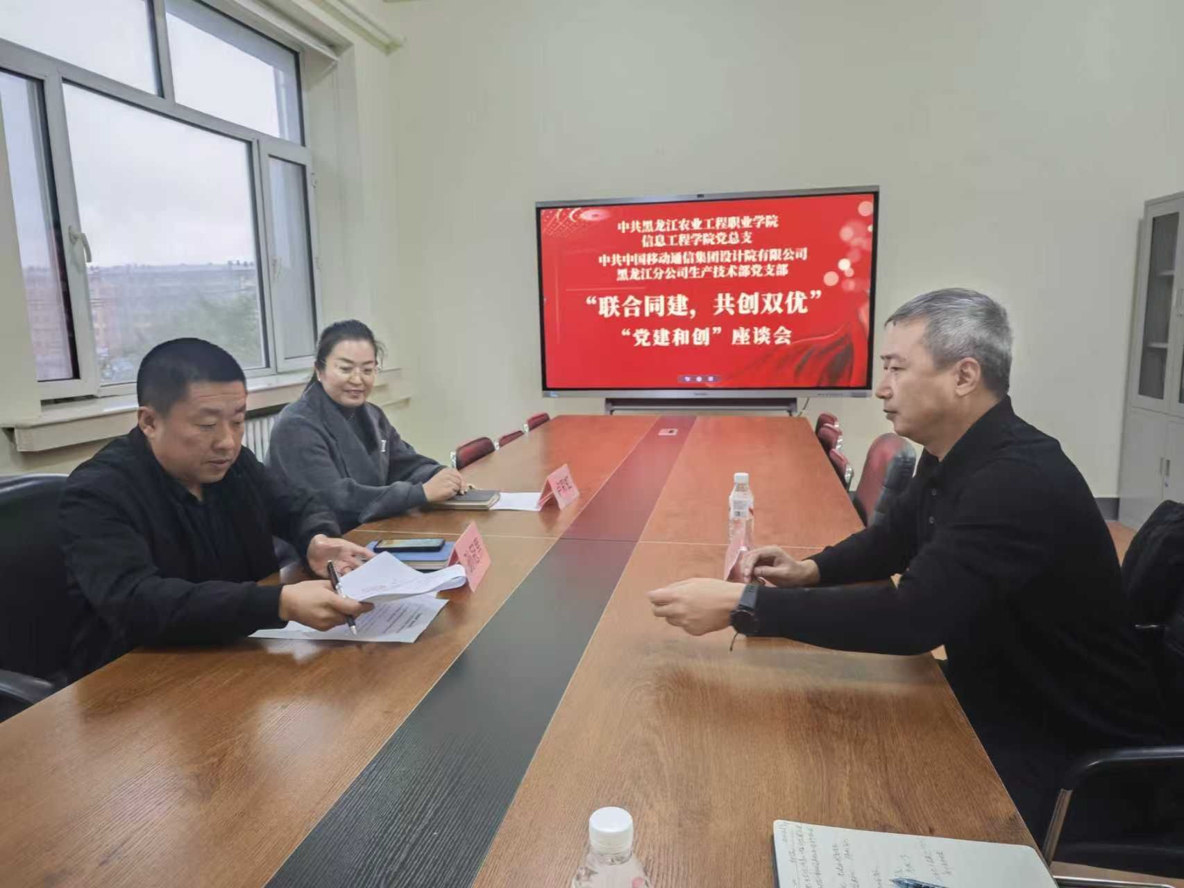 2025年10月15日,中国移动通信集团设计院有限公司黑龙江分公司生产技术部党支部书记刘成国一行与学院信息工程学院党总支联合开展“党建和创”专题交流活动。双方围绕深入学习贯彻党的二十大精神、落实新时代党的建设总要求,以“联合同建、共创双优”为目标,就深化基层党建合作、推动资源共享共赢展开深入探讨,为后续“党建和创”落地见效夯实基础。