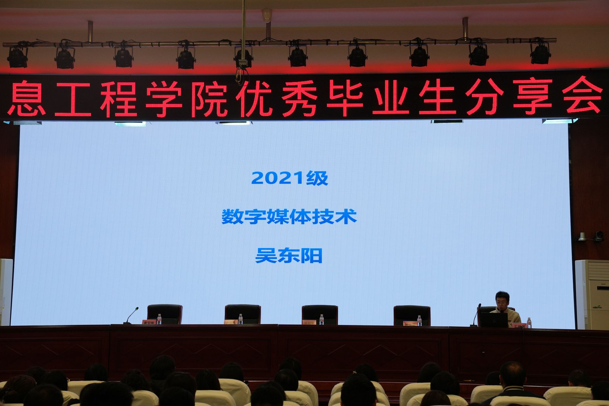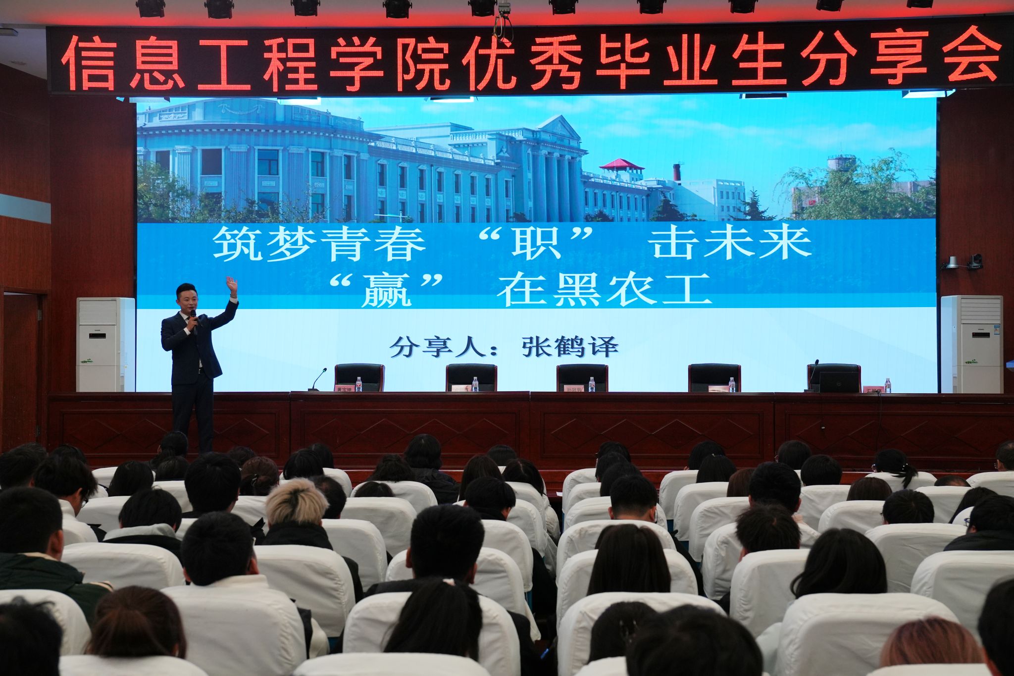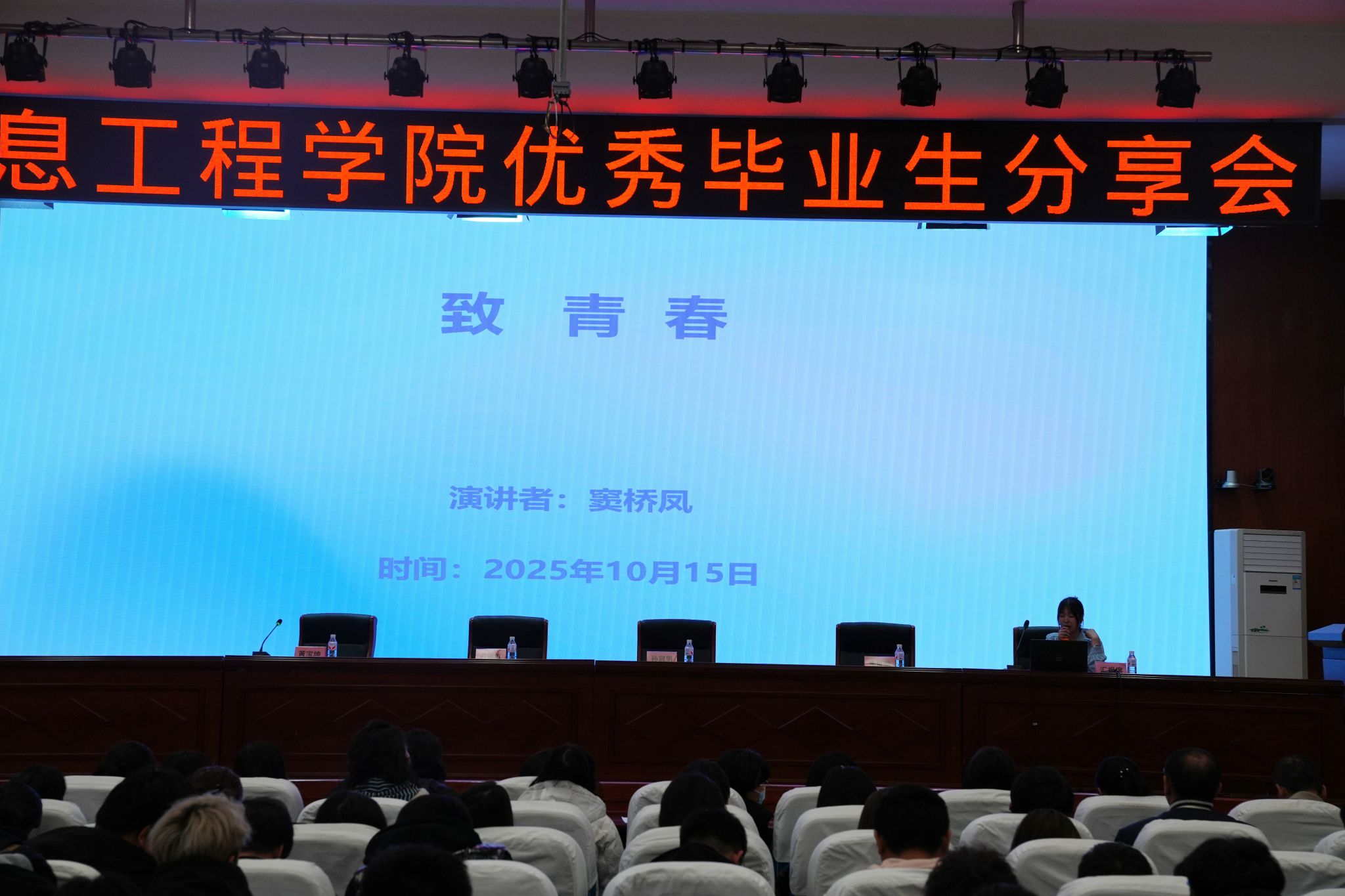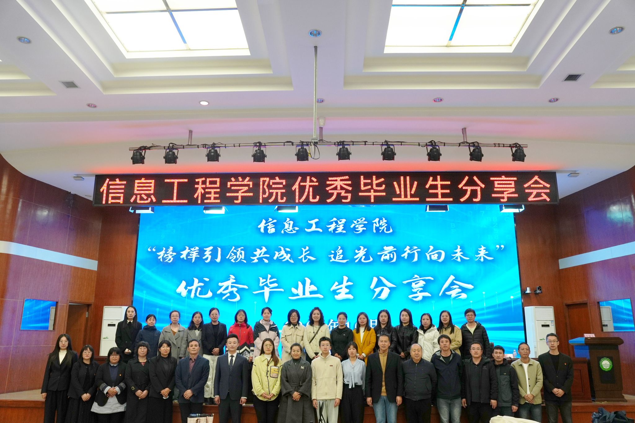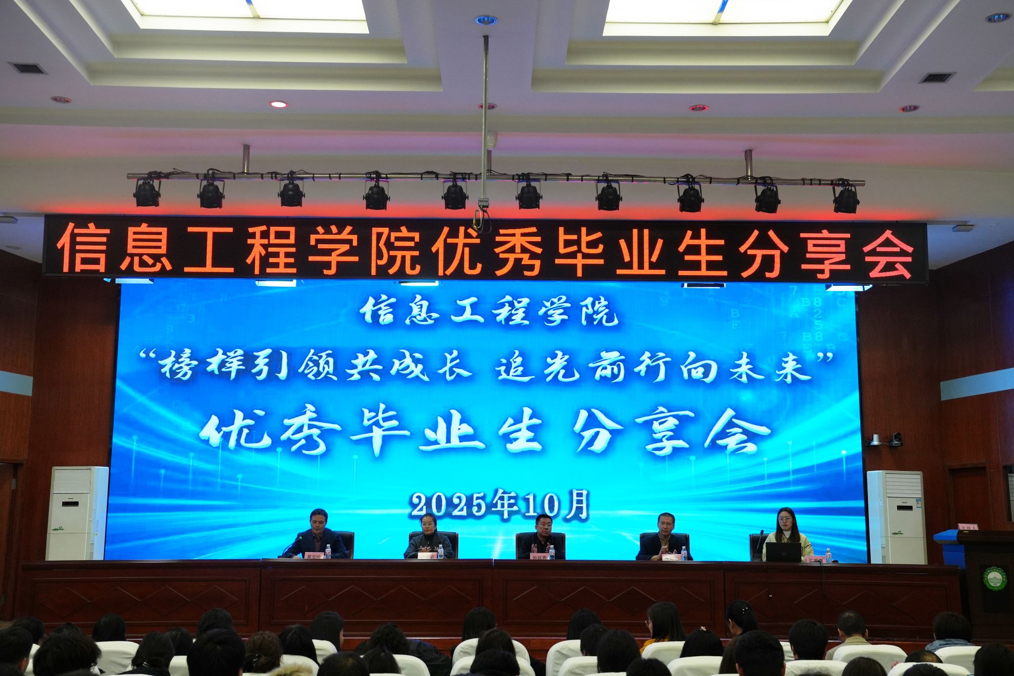 10月15日,信息工程学院在南岗校区艺学楼报告厅举办以“榜样引领共成长 追光前行向未来”为主题的优秀毕业生分享会。信息工程学院党政班子成员出席,全体教师与2024级、2025级学生代表共同参会。本次会议由教学副院长黄宝坤主持,旨在通过优秀毕业生的经验分享,帮助在校同学科学规划大学学习与生活,树立正确的成才观、就业观,全面提升就业技能与实践能力。