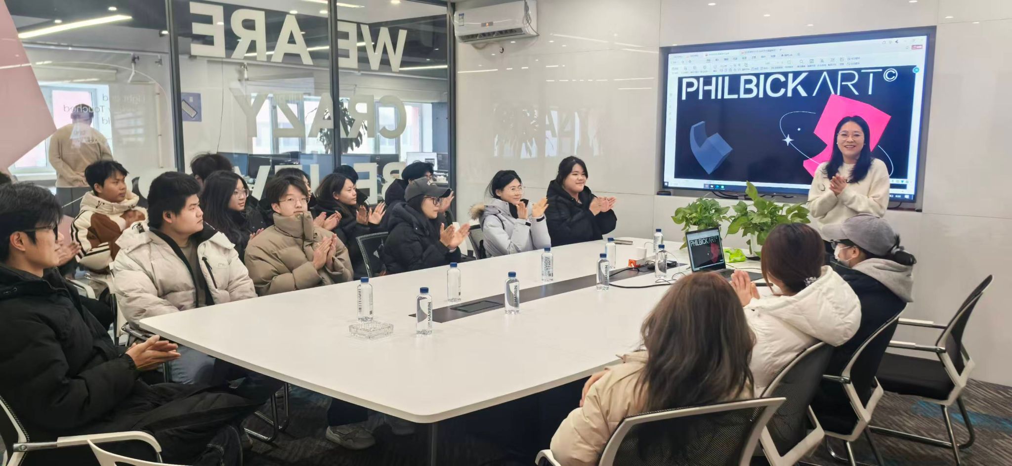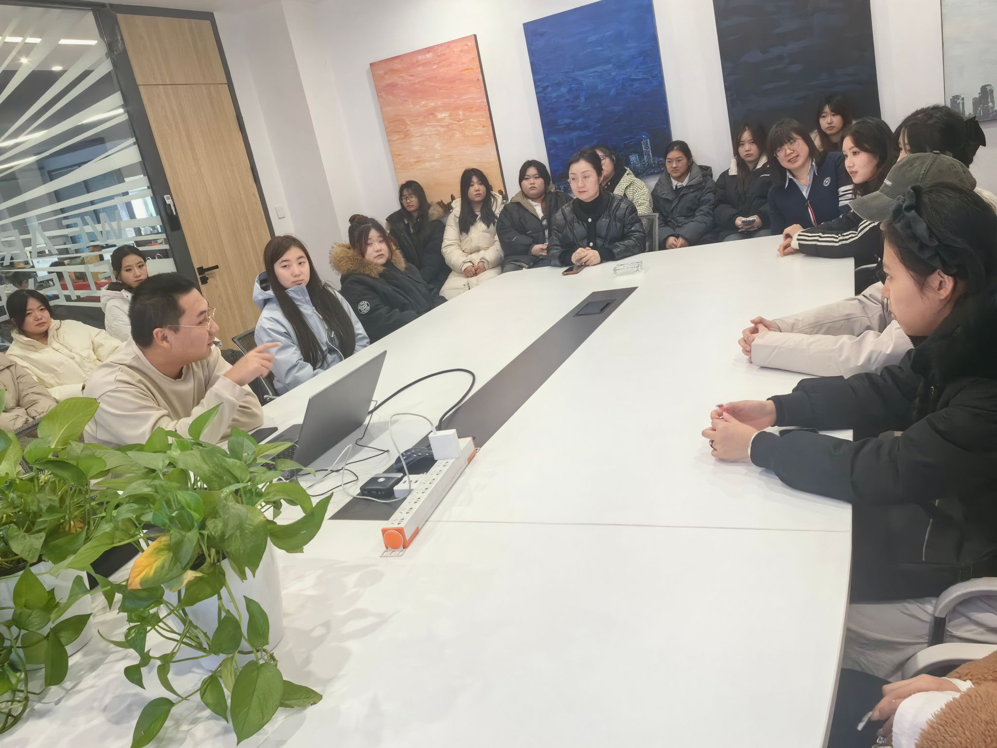 参观结束后,一场干货满满的行业分享会在企业会议室展开。作为拥有10余年数字媒体行业经验的资深从业者,项目经理沙鹏宇以“从校园到职场:数字媒体人的成长与行业新机遇”为题,结合自身从实习生成长为项目经理的经历,为学生们剖析行业发展新格局。“当前数字媒体行业已从‘单一技术应用’转向‘多技术融合’,尤其是AI生成式设计、数字孪生、虚拟交互等技术的普及,对从业者的‘技术整合能力’和‘文化解读能力’提出更高要求。