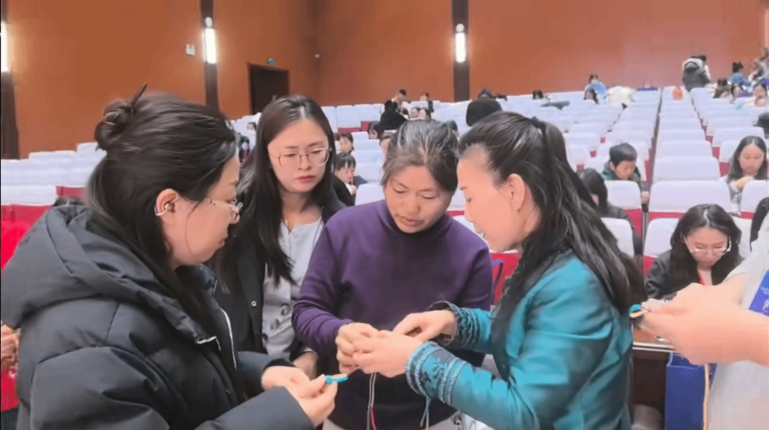 培训展示现场,两位教师默契配合,只见五彩丝线在指尖灵活盘绕、穿插、打结,一系列娴熟的操作行云流水。传统经典的一字扣、琵琶扣造型规整,寓意吉祥的花卉扣、蝴蝶扣栩栩如生,更有融入现代审美与数字设计理念的创新款盘花扣惊艳亮相,将传统工艺与当代设计完美融合。展示过程中,两位老师还结合研修所学,将数字媒体技术应用于非遗技艺传播与创新设计的实践案例,引发在场学员与专家的热烈反响。