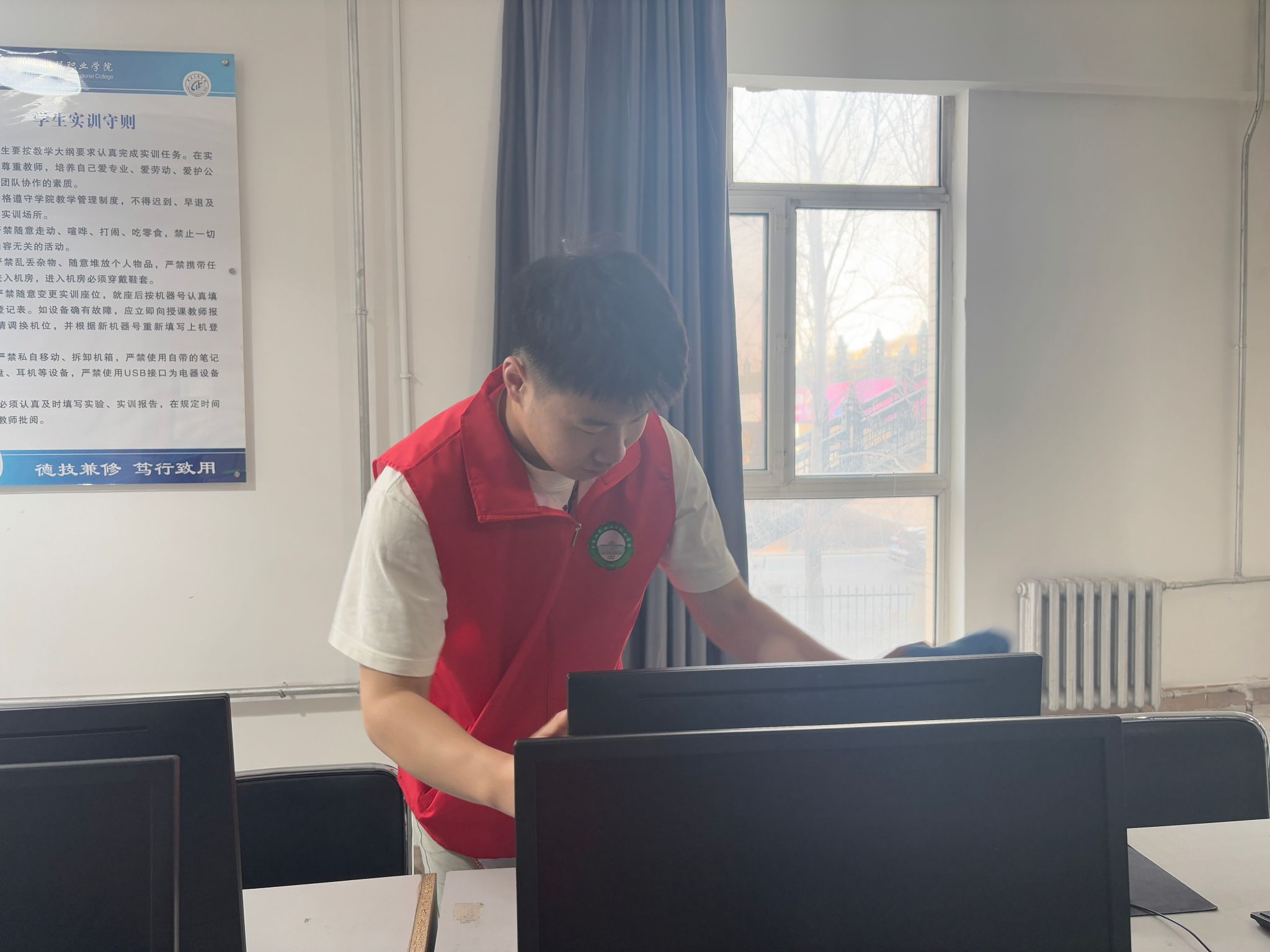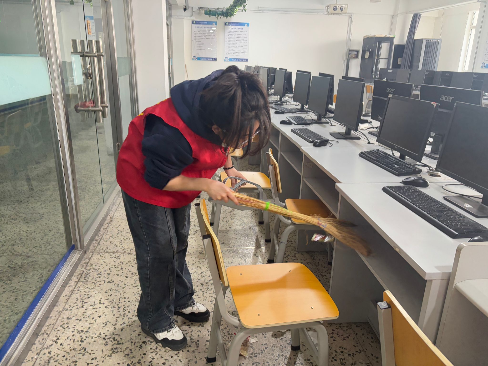 活动当日,志愿者们准时集合在机房门口,迅速投入到紧张而有序的清洁工作中。面对机房内众多的计算机设备和复杂的环境,志愿者们分工明确,配合默契。有的志愿者手持抹布,仔细擦拭着电脑屏幕、键盘和主机,不放过任何一处灰尘和污渍;有的则专注于清理地面,认真清扫每一个角落,随后又用拖把将地面拖得干干净净,确保机房环境整洁卫生。在清洁过程中,志愿者们还对计算机设备进行了简单检查,及时发现并报修了一些小故障,为同学们日后的使用提供了便利。