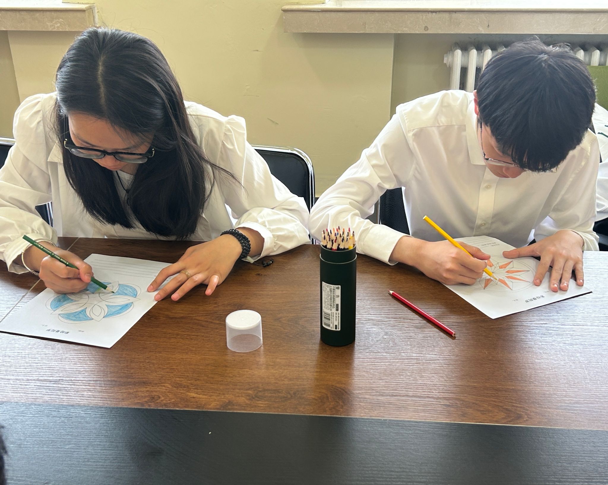 冥想结束后,同学们开始挑选心仪的色彩,拿起画笔在圆形画纸上勾勒线条、涂抹色彩。在绘画过程中,大家全神贯注,沉浸在自己的创作世界里。不同的色彩与线条在画纸上交织,逐渐形成一幅幅独特的曼陀罗图案。完成绘画后,同学们认真地为自己的作品取了专属名字,有的作品名为“向阳而生”,寓意着对积极生活的向往;有的取名“心灵的避风港”,表达出对宁静内心世界的渴望。随后,大家借助作品,将当下的情绪、感受和想法认真地写在纸上,有人倾诉了近期学业上的压力,有人分享了内心的喜悦,也有人表达了对未来的期待。