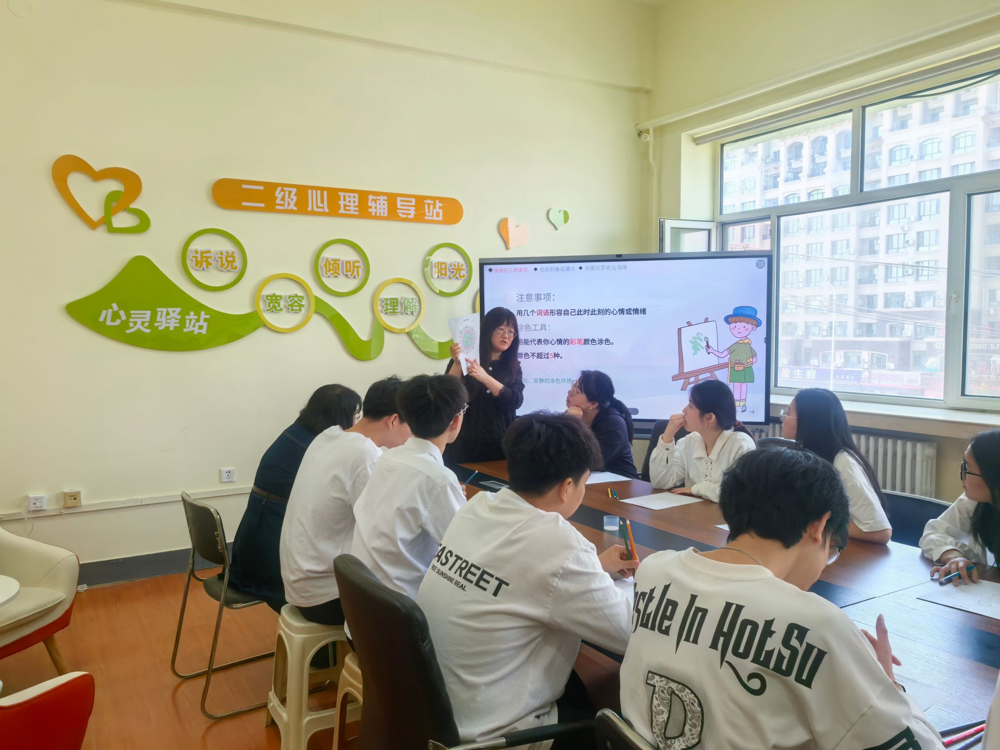活动伊始,负责心理工作的张老师向同学们详细介绍了曼陀罗绘画的起源、心理学意义及在心理健康辅导中的应用。张老师讲解道,曼陀罗在梵语中意为“坛城”,在心理学领域,它是表达潜意识的有效工具,能帮助人们整合内心世界,缓解焦虑与压力。为让同学们更好地进入创作状态,张老师带领大家进行了一分钟冥想。在轻柔舒缓的音乐声中,同学们闭上双眼,调整呼吸,放空思绪,放松身心,为后续的创作奠定了平静专注的基础。