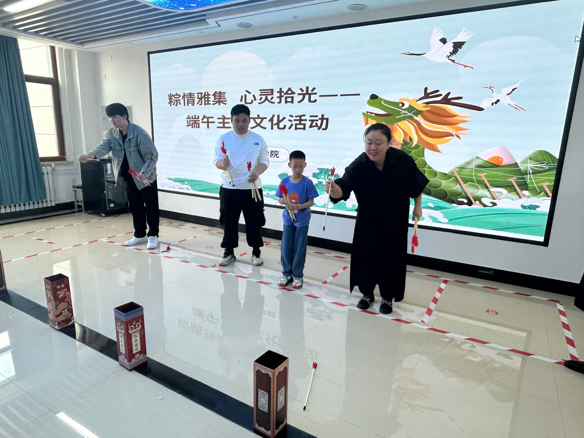 活动伊始,极具古风的投壶游戏便吸引了大批同学。投壶是古代士大夫宴饮时做的一种投掷游戏,也是一种礼仪。同学们手持箭矢,屏气凝神,瞄准壶口,奋力投掷。箭矢入壶的瞬间,现场欢呼声、喝彩声此起彼伏,大家在体验游戏乐趣的同时,也感受到了古人的雅致与智慧。