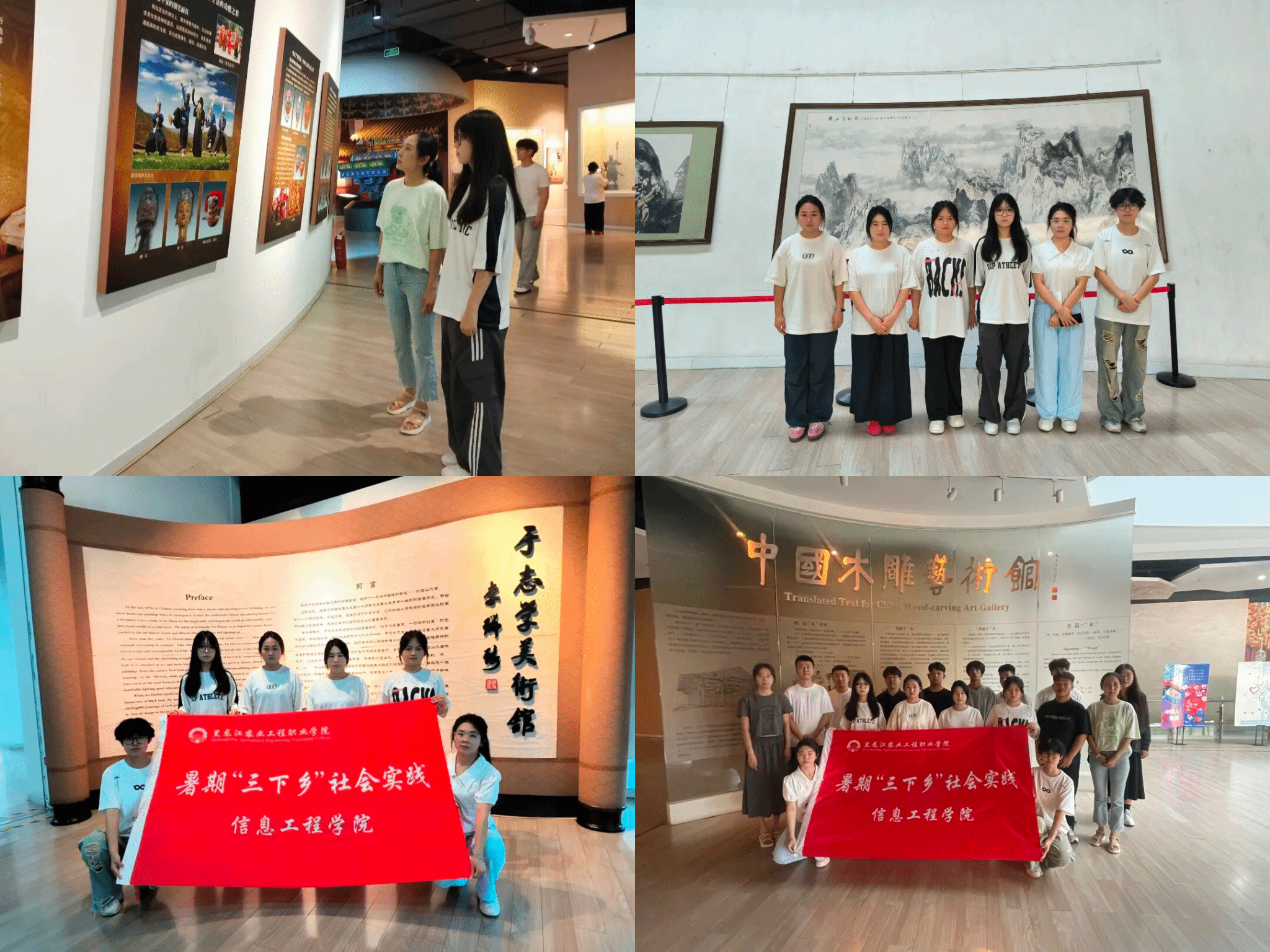为深入学习贯彻习近平新时代中国特色社会主义思想,在社会实践中传承文化根脉,进一步增强文化自信,推动中华优秀传统文化创造性转化和创新性发展。暑期“三下乡”社会实践团队分别前往中国木雕艺术馆、黑龙江省博物馆、威海市一战华工纪念馆、黑龙江省民族博物馆、哈尔滨冰雪文化博物馆。依托意蕴深厚、内涵丰富的文化资源,通过广泛开展展馆参观、艺术创作等实践活动,让中华优秀传统文化焕发新生。
