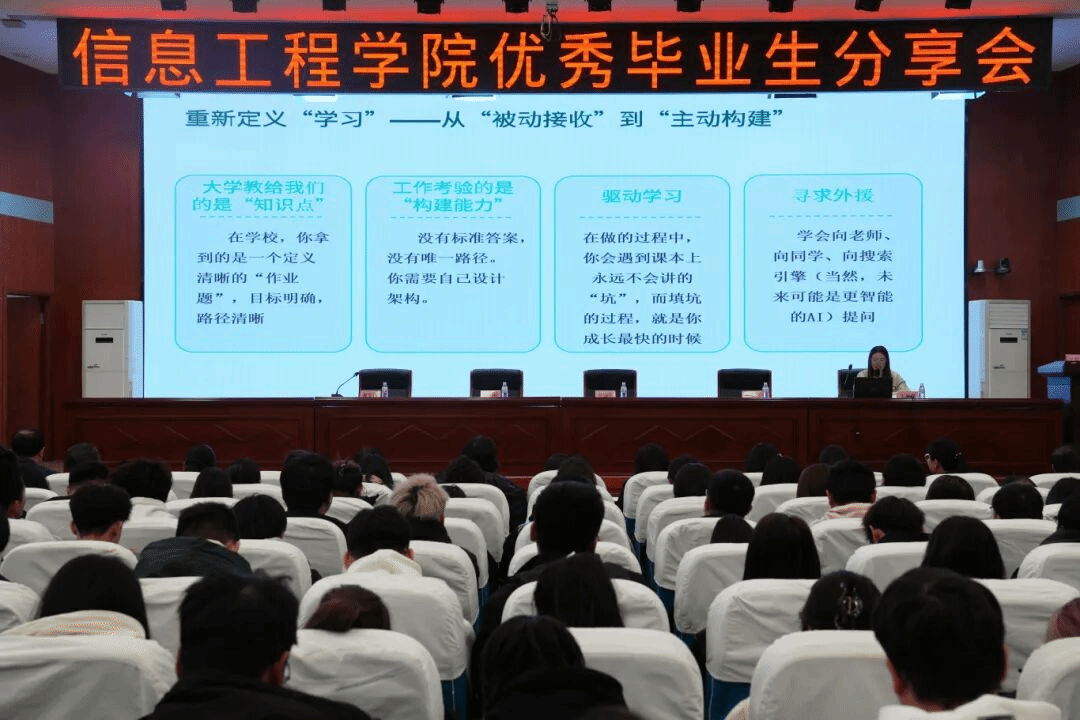 10月15日,信息工程学院在南岗校区艺学楼报告厅举办以“榜样引领共成长 追光前行向未来”为主题的优秀毕业生分享会。信息工程学院党政班子成员出席,全体教师与2024级、2025级学生代表共同参会。本次会议由教学副院长黄宝坤主持,旨在通过优秀毕业生的经验分享,帮助在校同学科学规划大学学习与生活,树立正确的成才观、就业观,全面提升就业技能与实践能力。