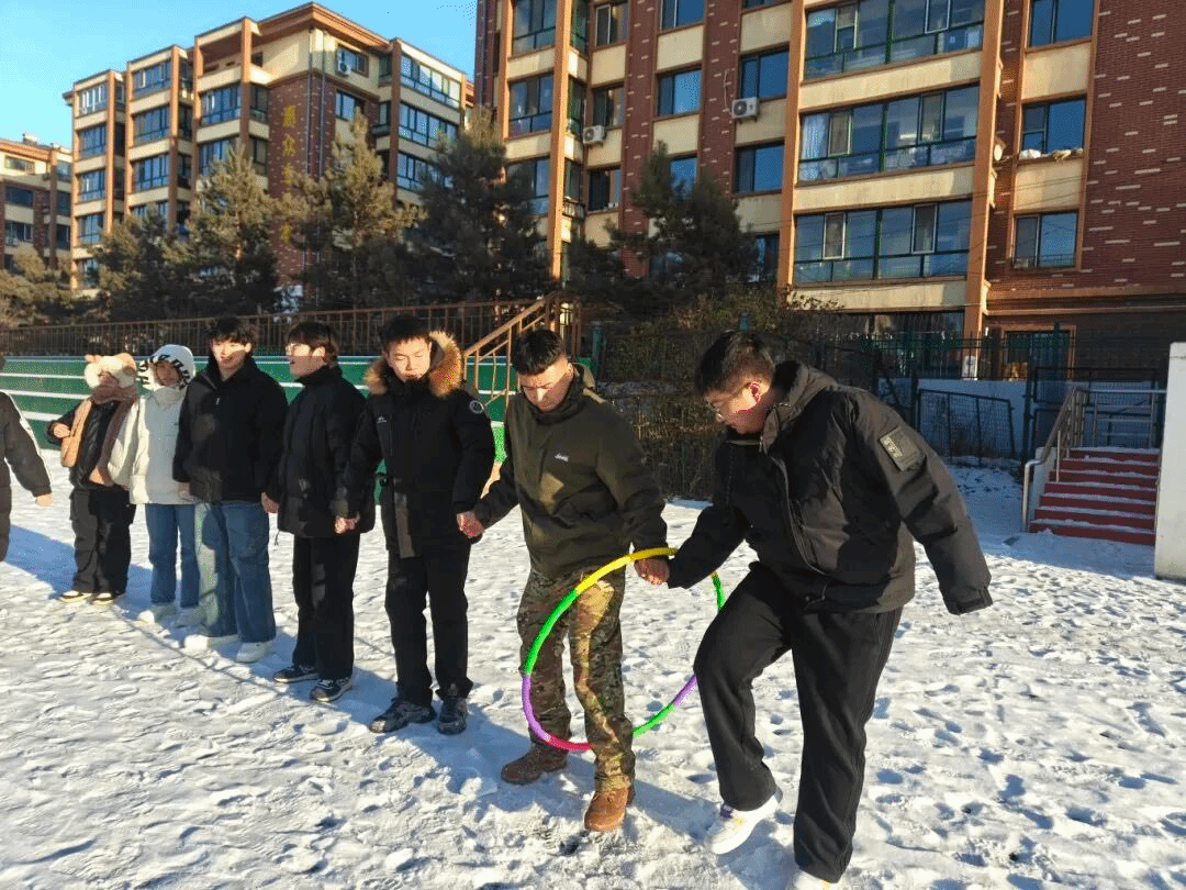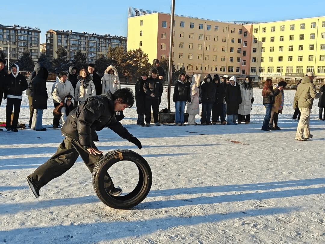 本次嘉年华活动内容丰富多元,设置了车轮滚滚、雪地蛟龙、无敌风火轮、一圈到底四大趣味项目,兼具竞技性与趣味性,让同学们在互动比拼中尽享冰雪欢乐。“车轮滚滚”中队员协力推进,“雪地蛟龙”考验团队默契,“无敌风火轮”里大家灵活穿梭,“一圈到底”比拼反应配合,各项目现场都热闹非凡,加油声与欢笑声交织,持续点燃活动热度。活动现场,每一个项目都充满了欢声笑语,每一处角落都洋溢着青春活力。同学们在雪地里尽情奔跑、协作比拼,不仅体验到了冰雪运动的乐趣,更在互动中加深了彼此的友谊,锤炼了团队协作能力。