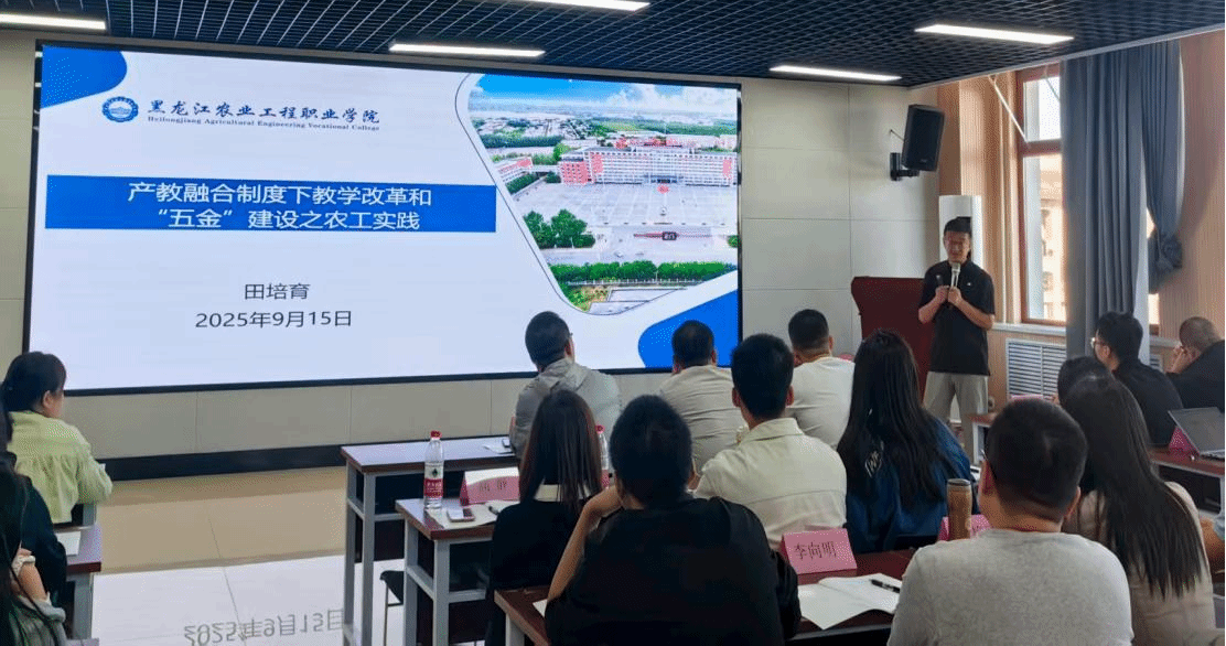 本次培训共计112学时,课程设置兼顾理论与实践:除职业教育政策解读、专业课程开发等理论教学内容外,还将组织参培教师走进哈尔滨电机厂有限公司、哈尔滨博实自动化技术有限公司等本土龙头企业开展实地调研,通过沉浸式体验感受行业前沿技术应用场景,切实提升参培教师的专业实践能力与教学改革创新水平,为黑龙江省自动化领域技术技能人才培养注入新动能,助力全省“4567”现代化产业体系建设提速增效。开幕式结束后,作为本次培训的首场专题讲座,副校长田培育以“产教融合制度下教学改革和‘五金’建设之农工实践”为题,从产教融合落地路径切入,为参培教师开启了培训第一课。