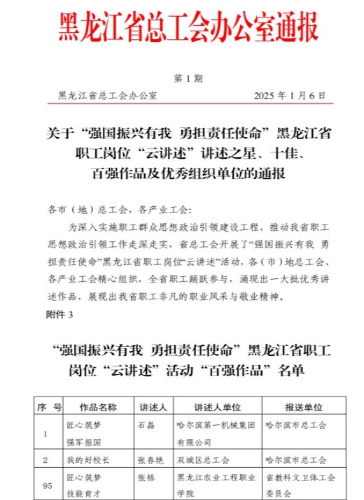 近日,黑龙江省总工会办公室下发了《关于“强国振兴有我 勇担责任使命”黑龙江省职工岗位“云讲述”讲述之星、十佳、百强作品及优秀组织单位的通报》,我院张栋老师作品“匠心筑梦 技能育才”被授予“百强作品”荣誉称号。