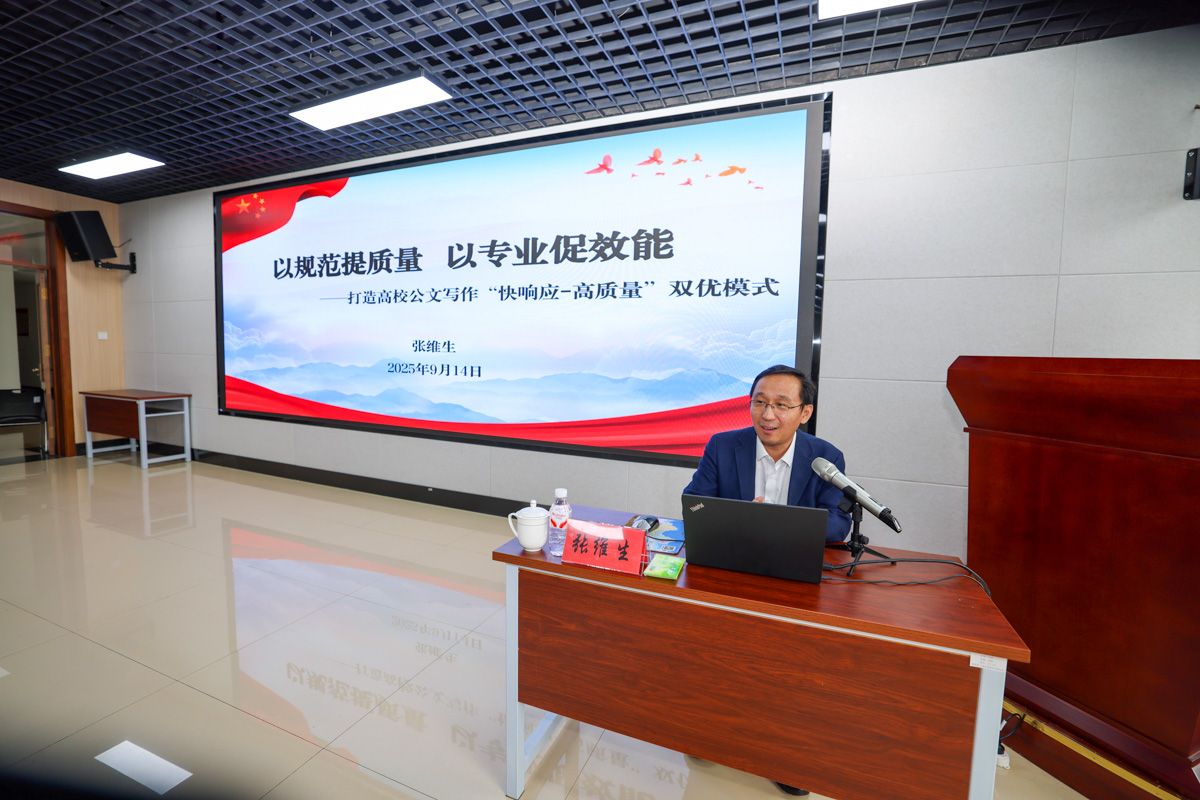 培训中,张维生以《打造高校公文写作“快响应-高质量”双优模式》为题,结合高校行政工作实际,精准指出公文拟制、办理、管理全流程中存在的“格式规范不严谨、内容质量不扎实、处理效能不高效”三大核心问题,并针对性提出“强化专业训练、优化流程机制、深化经验积累”三项解决对策。其讲解紧密贴合学校工作需求,对参训人员系统掌握公文知识、切实提升公文写作水平具有极强的指导性和实操性。