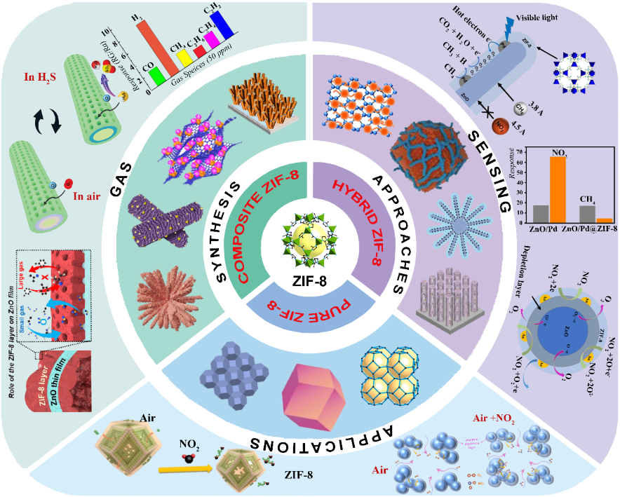 图1. ZIF-8及其衍生物的合成策略、气体传感机理与应用