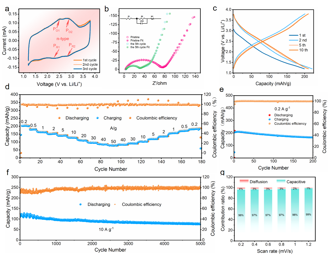 图2为BTT-PTO-COF在醚类电解液中的电化学性能及动力学分析,在0.2 A g−1的低电流密度下,BTT-PTO-COF电极能够提供高达213 mAh g−1的较高比容量。即使在50 A g−1的高电流密度下,BTT-PTO-COF电极仍展现出79 mAh g−1的令人印象深刻的比容量,且BTT-PTO-COF电极在10A g-1 电流密度下依然具有很好的循环稳定性,并对该材料的动力学进行了相应的分析,说明该材料在醚类电解液具有优异倍率性能。