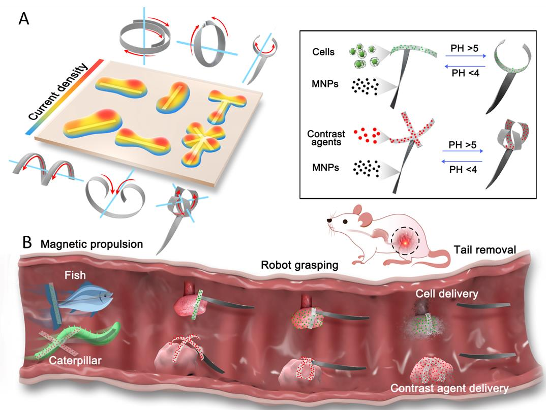 通过模块化软体微机器人制造方法,团队设计了经典的条状微机器人本体结构,并为其不同模块区域搭载了磁性纳米颗粒、造影剂(如微泡和荧光纳米颗粒)、功能性细胞、靶向药物等不同物质,使其能够兼具磁驱动、封闭空间显影反馈、靶向作业等性能。通过赋予微机器人本体不同模块特定的形变模式,使其能够感知生物活体环境中变化的体液离子浓度与pH值,发生局部区域同轴、异轴形变并通过磁驱动模仿毛虫蠕动、鱼类摆尾,实现运输、投递、移植、回收、降解等多序列复杂任务,有望在未来个性化靶向医疗中大展拳脚。