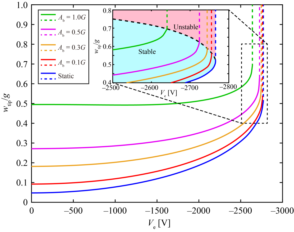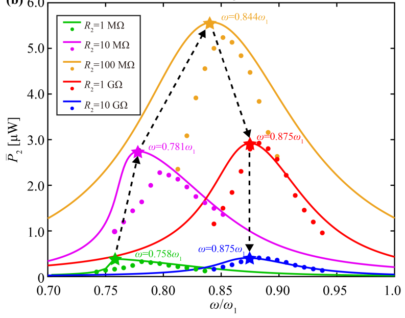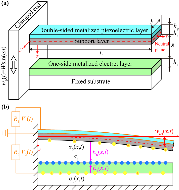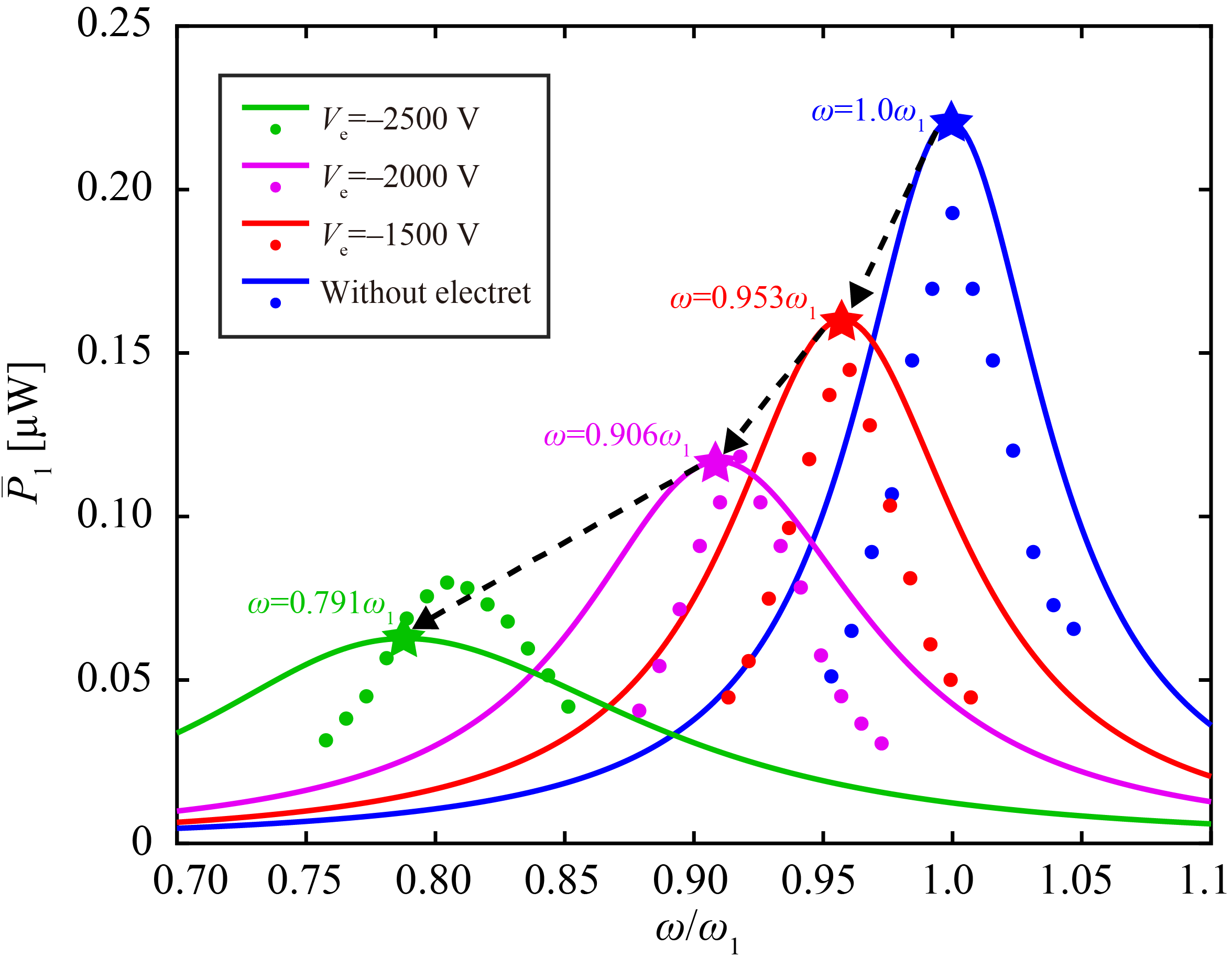 该团队与法国国立卡昂大学熊鹰研究员开展合作,提出了谐振频率可调的复合式静电—压电振动发电方法,以满足低功耗电子系统对高密度、谐振可调控的振动发电技术需求。通过在传统压电悬臂梁下方引入驻极体静电效应,不仅实现了静电力对谐振频率的调控,且额外的电阻尼提高功率输出。在前期研究软X射线静电驻极方法基础上,新型复合式发电机功率输出,相比传统单一压电悬臂梁发电机,显著提升至27.4倍;通过改变驻极体静电电位和阻性负载,发电机谐振频率可在176.1 rad/s范围内调控。该团队周子隆博士(2020级)为第二作者,其导师为第一作者。