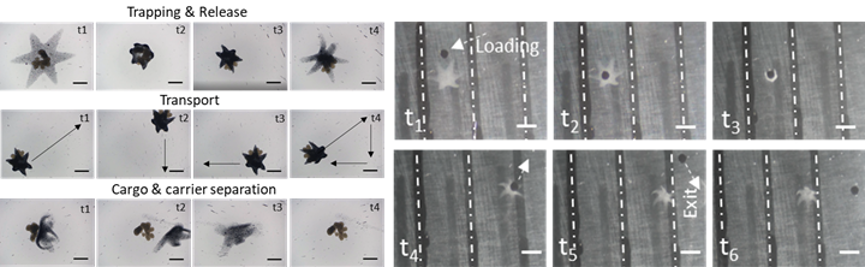 受海星捕食贝类运动过程的启发,团队以该非均一化水凝胶构建了仿海星微机器人,使其柔性触手能够在液体环境下以自主形变有效贴合任意目标的外部轮廓进行抓取与释放。通过非均匀电场交联固化,具有不同密度的水凝胶网络被嵌入到仿海星微机器人的褐藻酸单层薄膜结构中,在微机器人进入人体等活体消化系统后,即能感应pH环境(胃pH:1-3、肠道pH:6-8)自主形变。