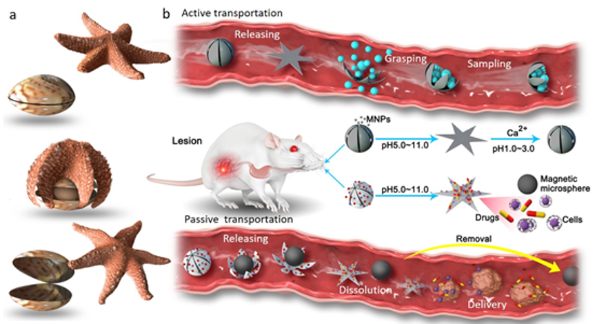 仿海星微机器人可模仿海星的多种驱动模式。如通过捕获磁性微球,以“搭便车”的形式随磁球在磁场作用下被动运动,或通过机器人体内封装磁性纳米材料实现磁驱主动运动。最后,在到达目标区域后,通过自主形变调整姿态完成贴附、投递、采样等不同作业任务。这种由水凝胶单一材料构建的全新微机器人还具有完全的生物可降解性,能够解决活体封闭环境下完成作业后的回收难题。